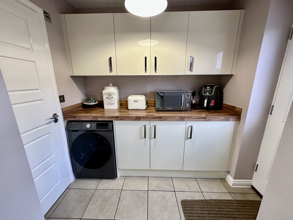 UTILITY ROOM 5' 3" x 7' 2" (1.62m x 2.19m) Separate utility space that benefits from matching cabinetry at both eye and base level, work surfaces with matching splash backs, tiled flooring, radiator, plumbing for a washing machine, door to the WC and rear facing double glazed door to the garden.