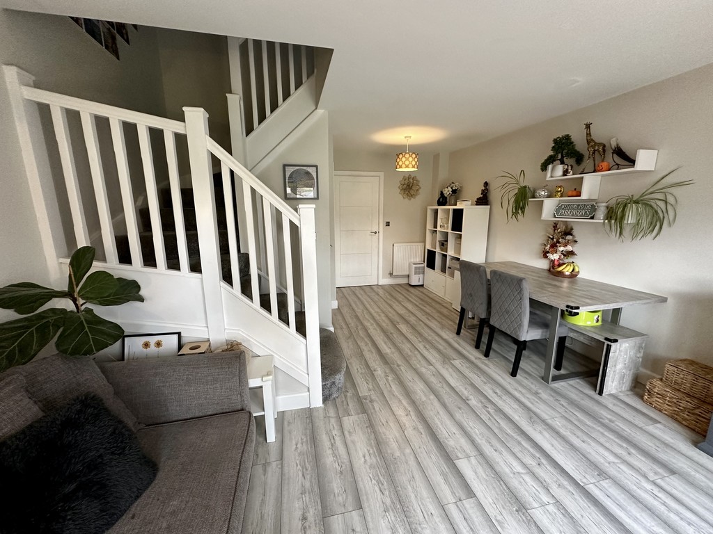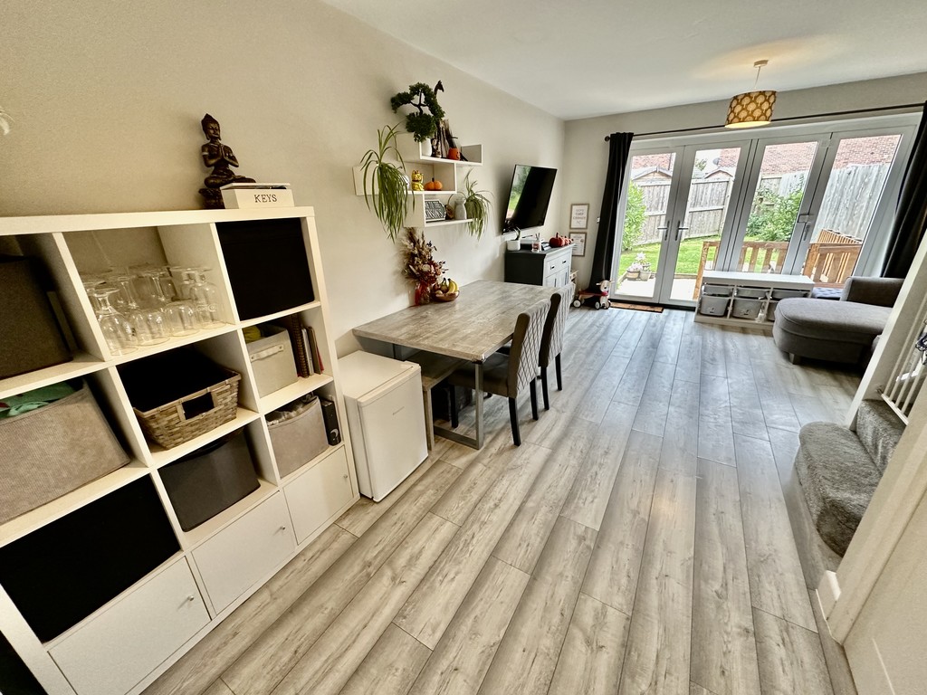 LIVING/DINING ROOM 13' 5" x 19' 1" (4.10m max x 5.84m max) Fabulous bright L-shaped reception room incorporating stairs to the first floor, bi-folding doors allow the reception room to open up into the garden space, providing a perfect entertaining area for purchasers, with door to the kitchen, storage cupboard beneath the stairs, laminate flooring and two radiators.