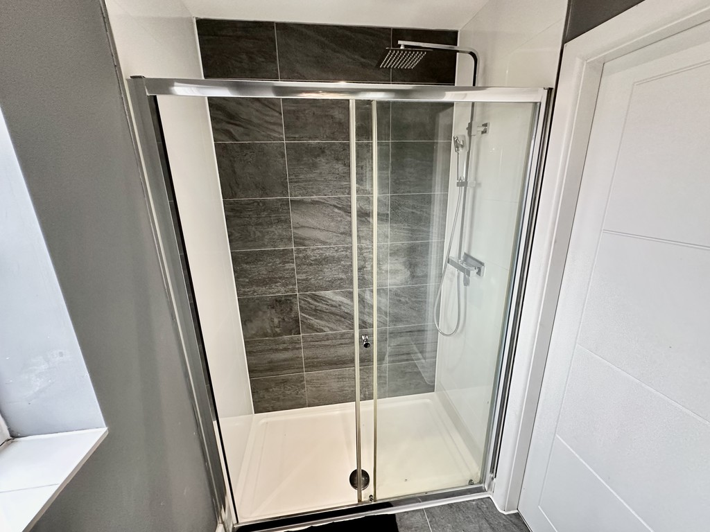SHOWER ROOM 4' 6" x 8' 3" (1.39m x 2.53m) Superb shower room with modern wash hand basin, low flush WC, walk-in shower cubicle with dual shower head including rainfall head, tiled flooring, partially tiled walls, heated towel radiator, spotlights, extractor fan and side facing double glazed frosted window.