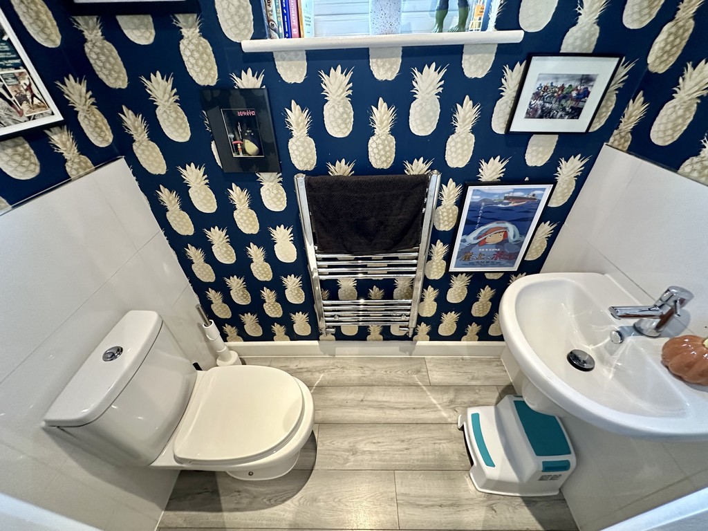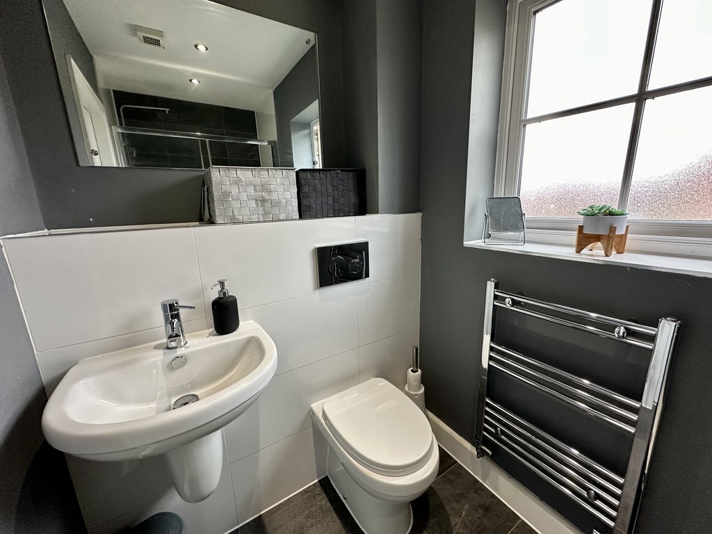 WC 3' 0" x 5' 5" (0.92m x 1.67m) Benefitting from a low flush WC, wash hand basin, heated towel radiator, partially tiled splash backs, laminate flooring, spotlights and a side facing double glazed frosted window.