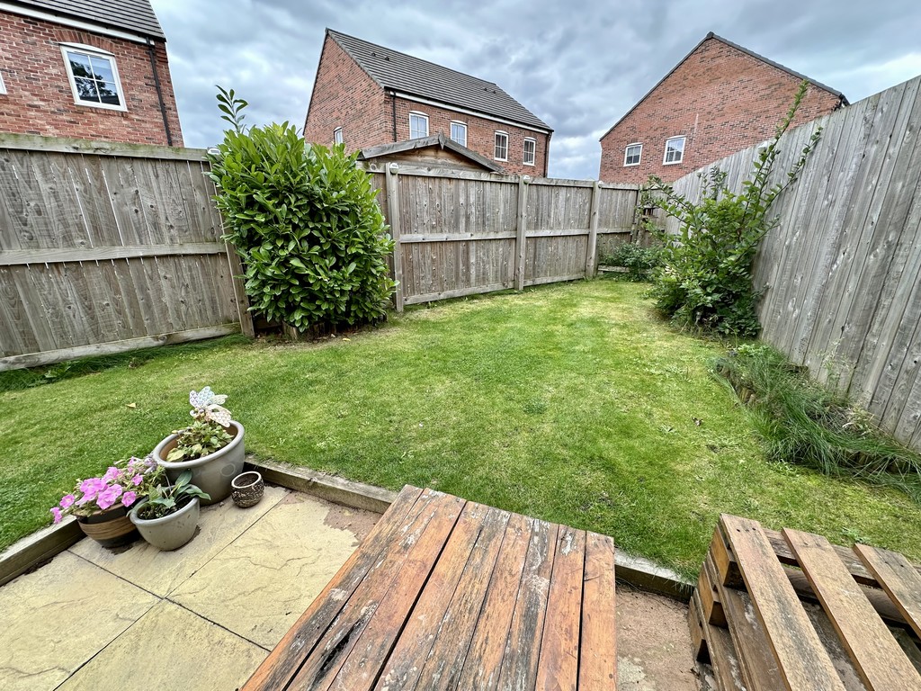 REAR GARDEN V-shaped lawned garden, paved patio, fence enclosed, outside water tap, external double power point and solar lighting included.
