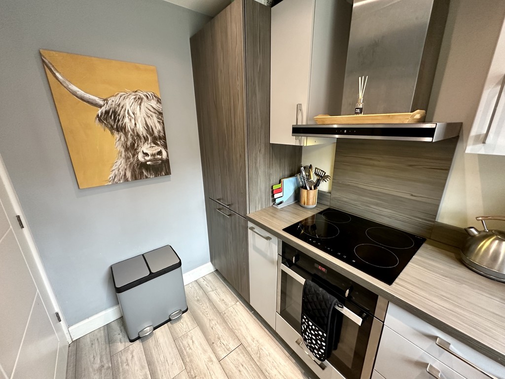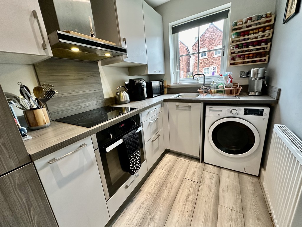 KITCHEN 5' 10" x 8' 11" (1.79m x 2.73m) Modern kitchen with a range of fitted cabinetry at both eye and base level, square edge work surfaces with matching splash backs incorporating a single bowl sink with drainer, four ring electric hob with extractor hood above, single electric oven, integrated fridge/freezer, plumbing for a washing machine, boiler unit in matching cupboard, radiator, laminate flooring, spotlights and front facing double glazed window.