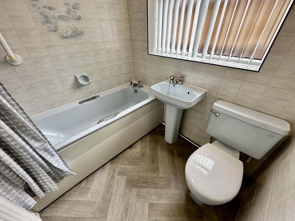 BATHROOM 6' 2" x 5' 6" (1.89m x 1.69m) Nicely presented bathroom with a three piece suite comprising of a low flush WC, wash hand basin basin, bath with shower curtain rail above, shower unit above bath, coving, tiled walls and a side facing double glazed frosted window.