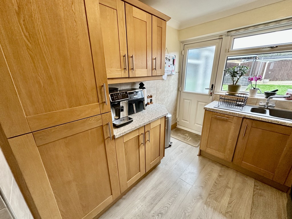 KITCHEN 8' 5" x 9' 9" (2.57m x 2.98m max) Lovely kitchen with a range of fitted kitchen cabinetry at both eye and base level, work surfaces incorporating a single and half bowl sink with drainer unit, four ring electric hob with extractor fan above, double electric oven, partially tiled splash backs, integrated fridge/freezer, integrated slimline dishwasher, plumbing for a washing machine, coving, rear facing double glazed window and rear facing double glazed frosted door.