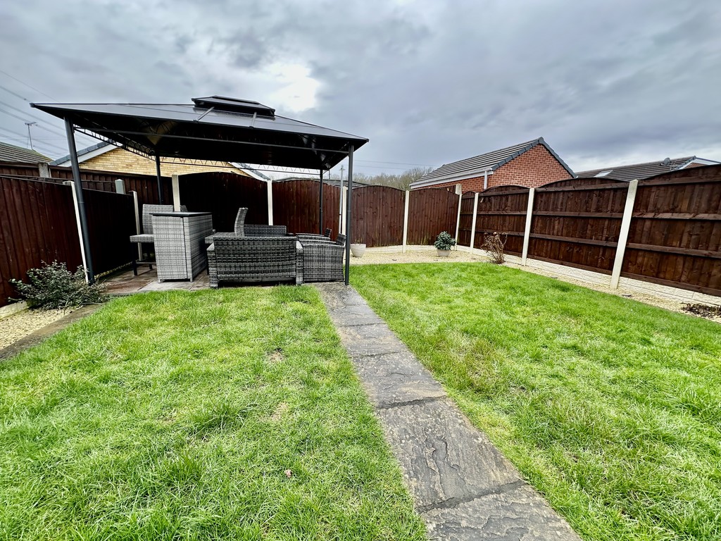 SIDE/REAR GARDEN Fence enclosed garden with two storage sheds to the side, one of which benefits from power, rear lower paved patio area, elevated lawn with central path leading to a further seating area at the rear of the garden with gazebo included and surrounding gravelled border.
