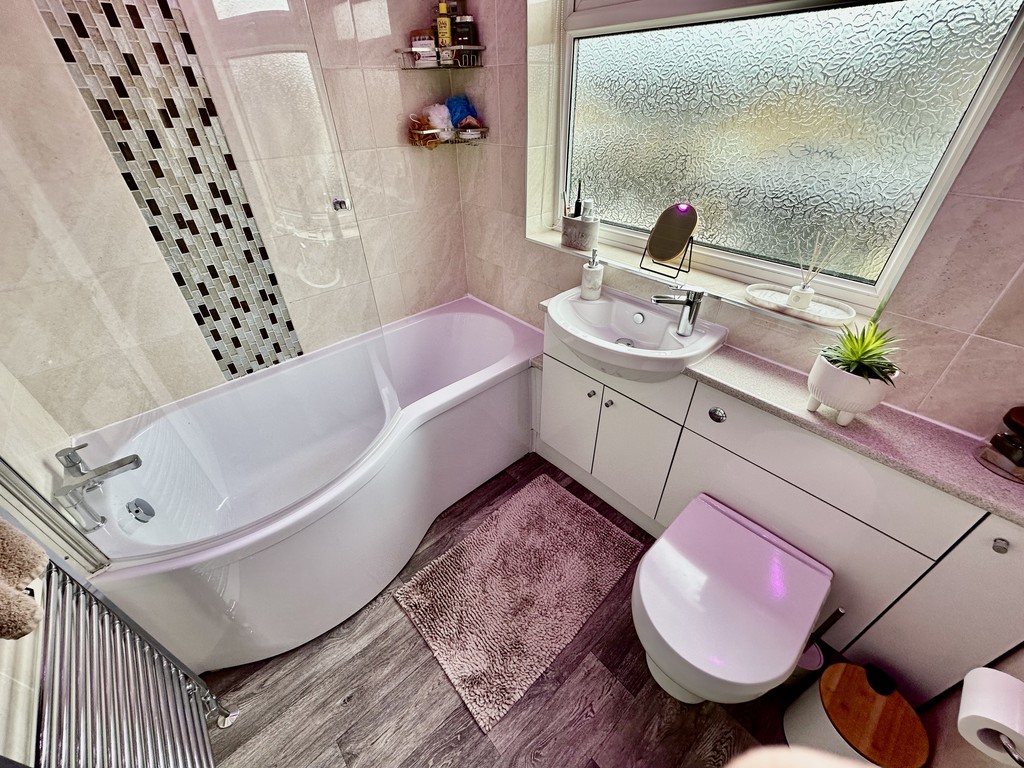BATHROOM 6' 11" x 5' 4" (2.13m x 1.64m) Superb bathroom with three piece suite, feature coloured spotlighting, low flush WC, wash hand basin within a vanity unit, P-shaped bath with glass shower screen, electric wall mounted shower, tiled walls, heated towel radiator and rear facing double glazed frosted window.