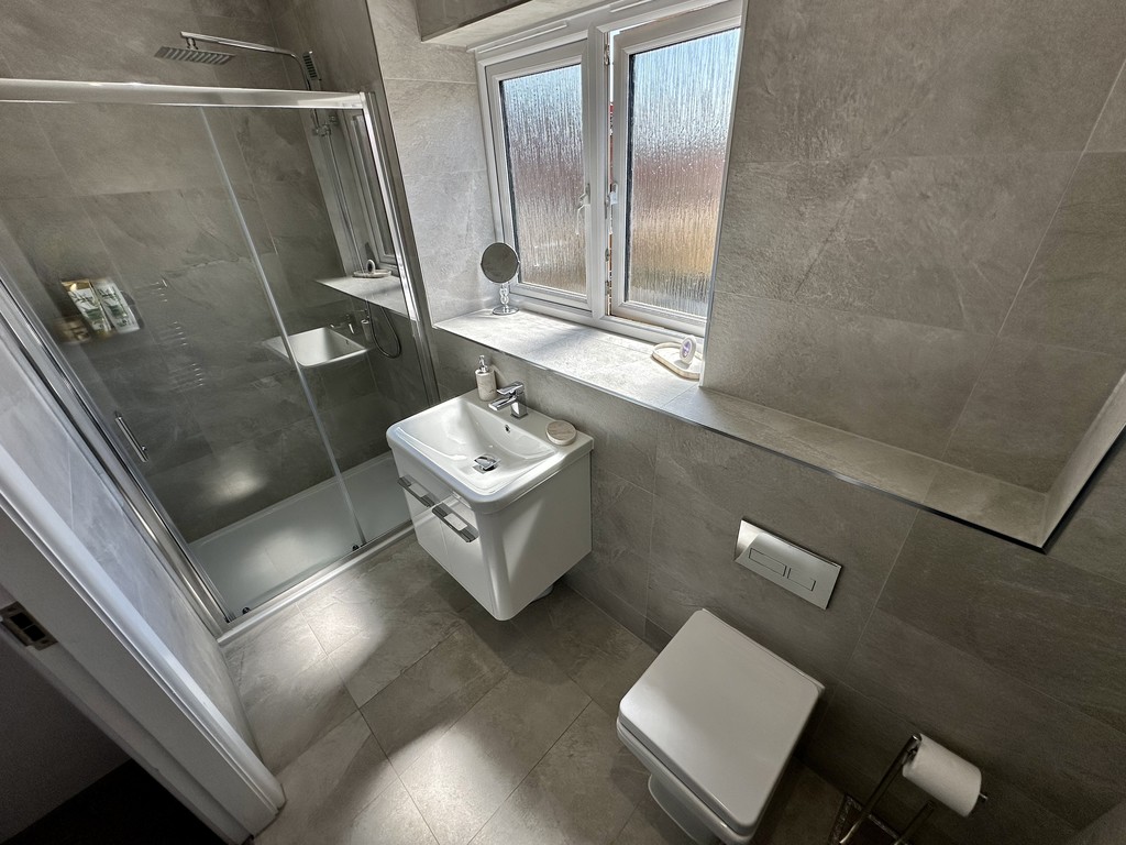 ENSUITE 10' 0" x 4' 5" (3.06m x 1.36m) Beautiful shower room with low flush WC, floating wash hand basin within a vanity unit, shower cubicle with dual shower head, spotlights, extractor fan, tiled walls, tiled flooring and a rear facing double glazed frosted window.