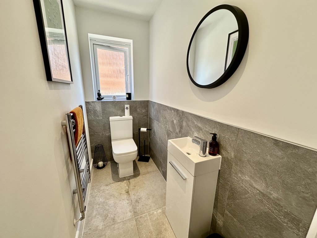 WC 6' 11" x 3' 4" (2.13m x 1.04m) Benefitting from a low flush WC, wash hand basin within a vanity unit, heated towel radiator, spotlights, half tiled walls, tiled flooring and a side facing double glazed frosted window.