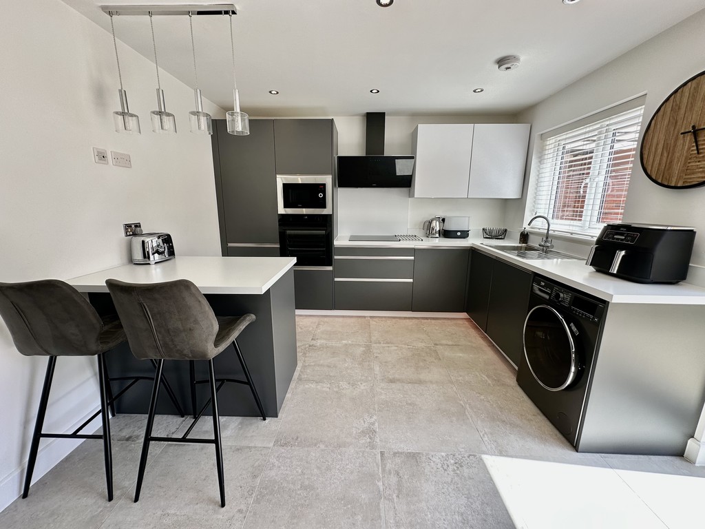 KITCHEN/BREAKFAST ROOM 13' 3" x 11' 1" (4.05m x 3.40m) Stunning modern kitchen with matching breakfast bar, fabulous cabinetry, work surfaces with matching splash backs, single bowl sink, four ring electric hob with extractor fan above, single electric oven, integrated microwave, integrated dishwasher, integrated fridge/freezer, plumbing for a washing machine, tiled flooring, spotlights, under cabinetry LED lighting, open access to the dining area, rear facing double glazed window and rear facing double glazed French doors to the garden.