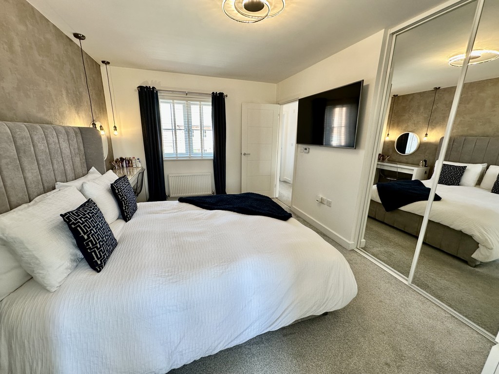 BEDROOM 10' 0" x 14' 3" (3.05m x 4.35m) Superb main bedroom with fitted sliding wardrobes, door to the en-suite shower room, front facing double glazed window and a radiator.