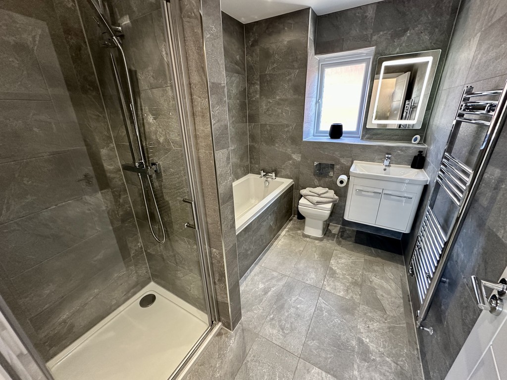 BATHROOM 8' 5" x 6' 7" (2.59m x 2.01m) Stunning bathroom with separate shower cubicle, bath, wash hand basin within a vanity unit, low flush WC, spotlights, tiled flooring, tiled walls, LED mirror, extractor fan, heated towel radiator and side facing double glazed frosted window.