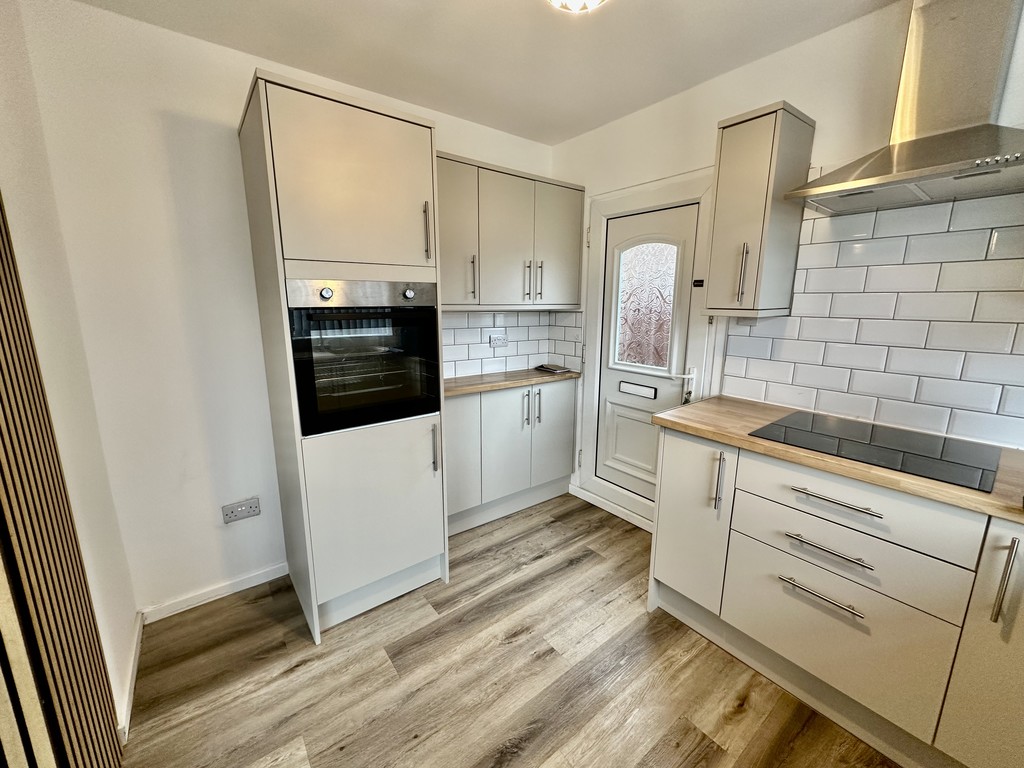 KITCHEN 8' 0" x 10' 5" (2.44m x 3.19m) Beautiful kitchen with a range of modern fitted cabinets at both eye and base level, work surfaces incorporating a single bowl sink with drainer, four ring electric hob with extractor hood above, partially tiled splash backs, single electric oven, plumbing for a washing machine, space for a fridge/freezer, open access to the lounge/diner, front facing double glazed window and side facing double glazed frosted door to the driveway.