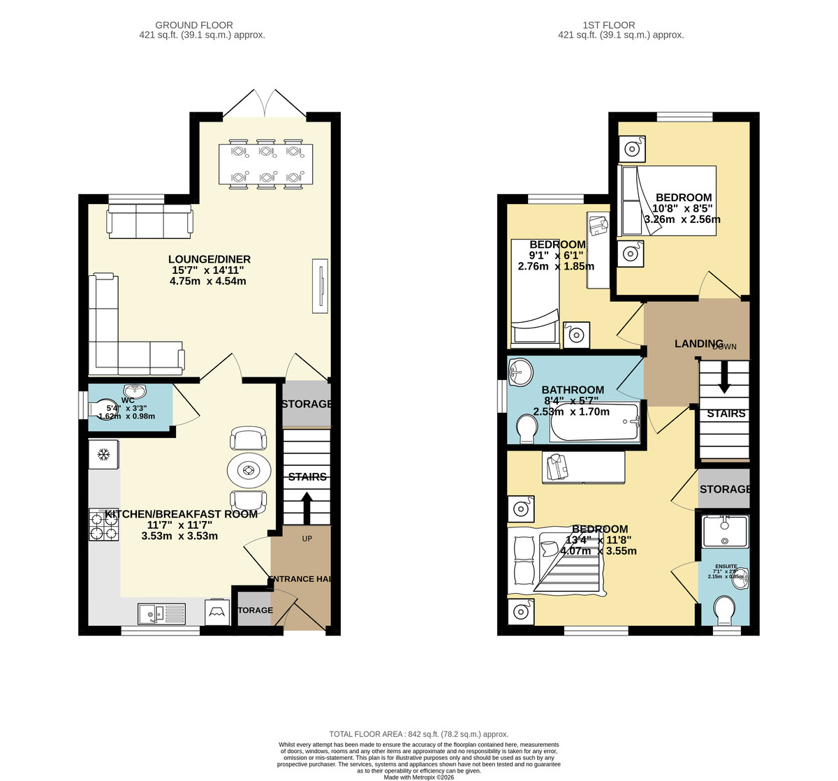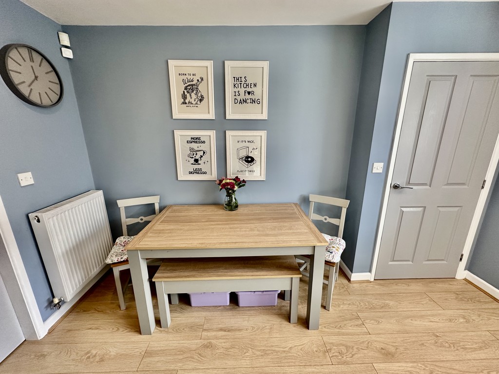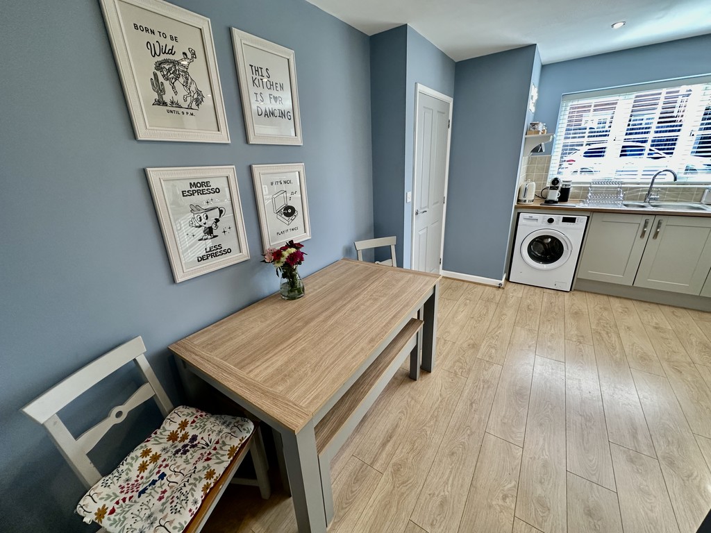 KITCHEN/BREAKFAST ROOM 11' 6" x 11' 6" (3.53m x 3.53m) Beautiful kitchen space with room for a breakfast table, a range of modern fitted kitchen cabinetry at both eye and base level, work surfaces incorporating a single and half bowl sink with drainer unit, four ring gas hob with extractor hood above, single electric oven, integrated fridge/freezer, plumbing for a washing machine, partially tiled walls, spotlights, radiator, laminate flooring, door to the WC, door to the lounge/diner and front facing double glazed window.