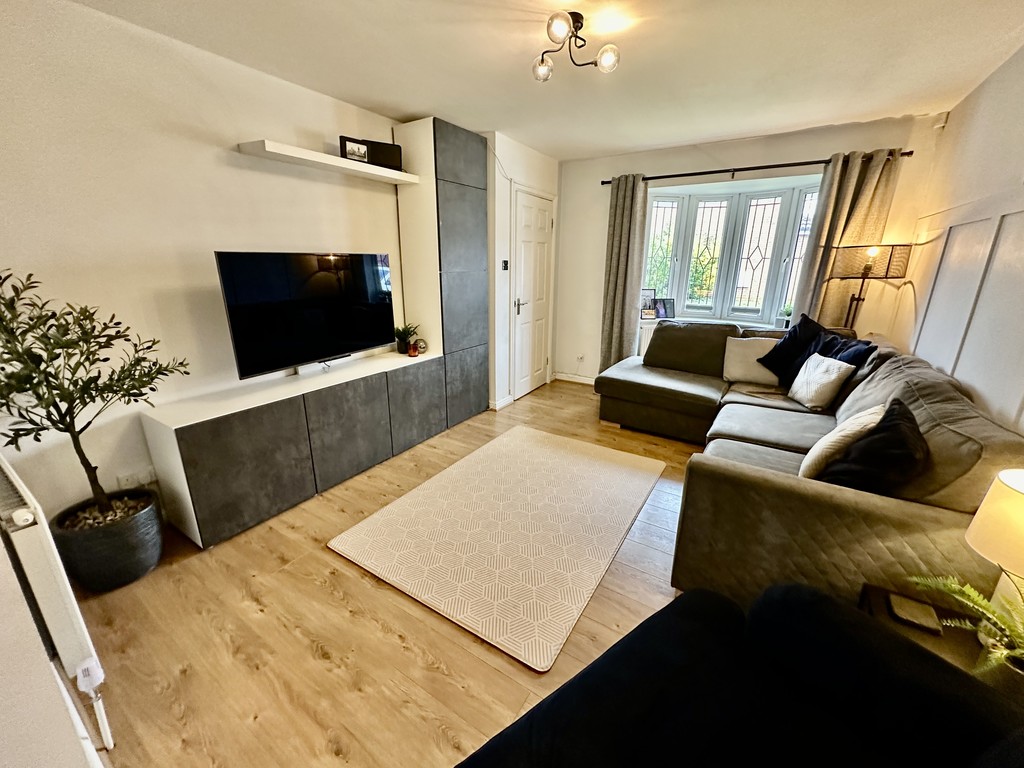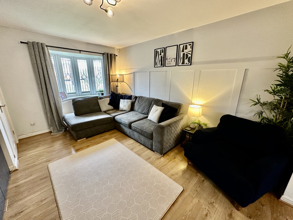 LIVING ROOM 11' 2" x 14' 2" (3.40m max x 4.33m) Fabulous reception space with front facing double glazed bow window, open access to the kitchen/diner, radiator, laminate flooring and partial wood panelled feature wall.