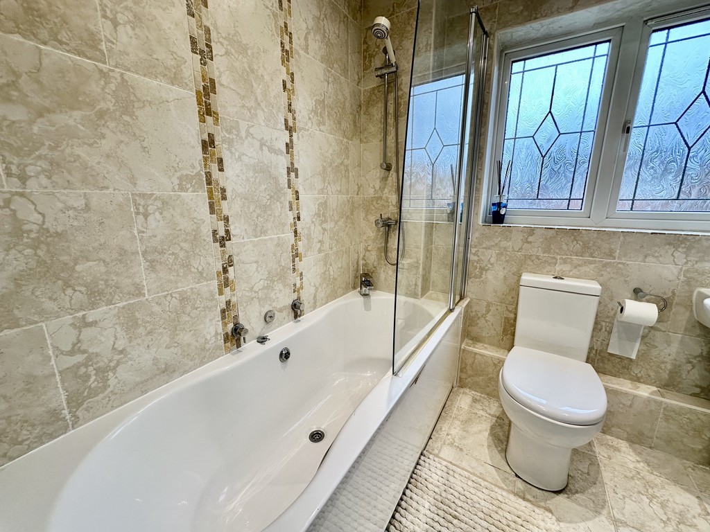 BATHROOM 7' 7" x 6' 0" (2.32m x 1.84m) Nicely presented bathroom with a three piece suite comprising of a low flush WC, wash hand basin, bath with glass shower screen, shower unit is wall mounted, heated towel radiator, extractor fan, tiled walls, tiled flooring, spotlights and a rear facing double glazed frosted window.