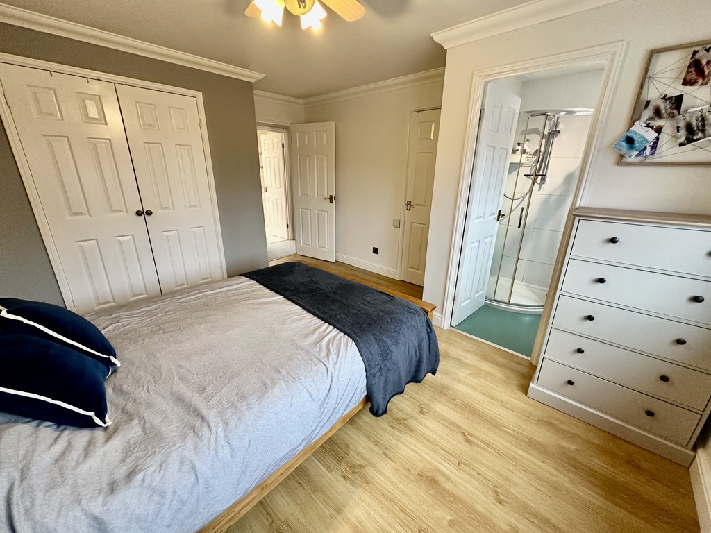 BEDROOM 11' 6" x 14' 5" (3.51m max x 4.40m max) L-shaped master bedroom with door to the en-suite shower room, built in wardrobes, storage cupboard above the stairs, radiator, central ceiling fan, coving to the ceiling and laminate flooring.
