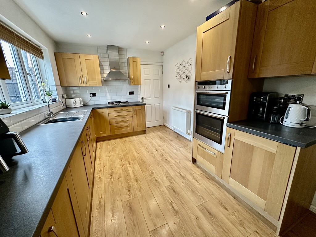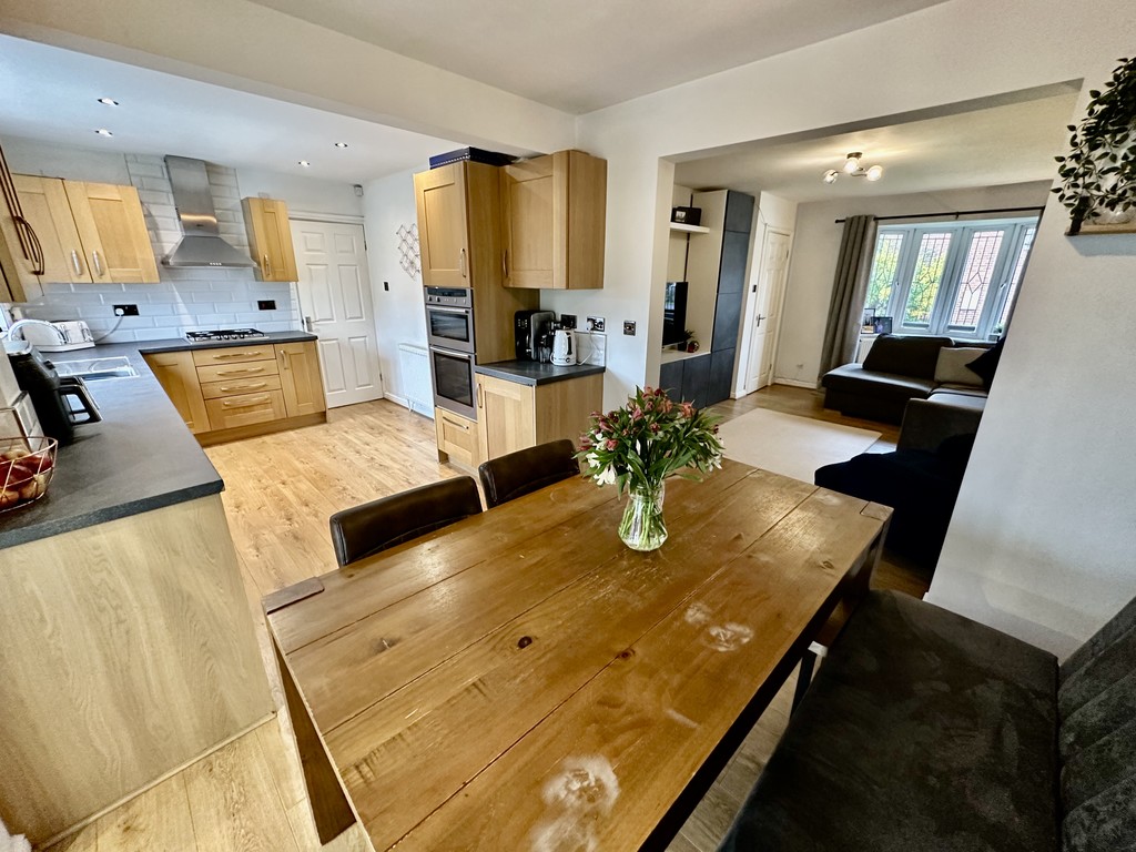 KITCHEN/DINER 19' 7" x 8' 11" (5.97m x 2.74m) Superb family kitchen/dining space with a range of fitted cabinetry at both eye and base level, work surfaces incorporating a single bowl sink with drainer, integrated dishwasher, integrated washing machine, integrated fridge, four ring gas hob with extractor hood above, double electric oven, partially tiled splash backs, laminate flooring, rear facing double glazed window, internal door to the side entrance area and rear facing double glazed French doors to the conservatory.