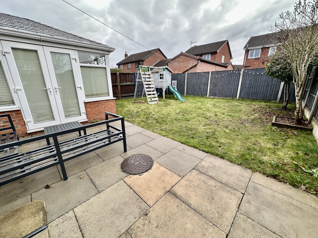 REAR GARDEN Fence enclosed rear garden mainly laid to lawn with paved patio, side storage area and side access to the front via a gate.