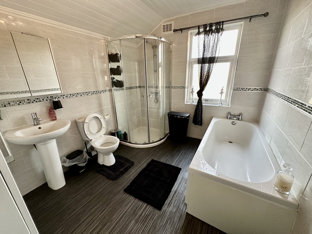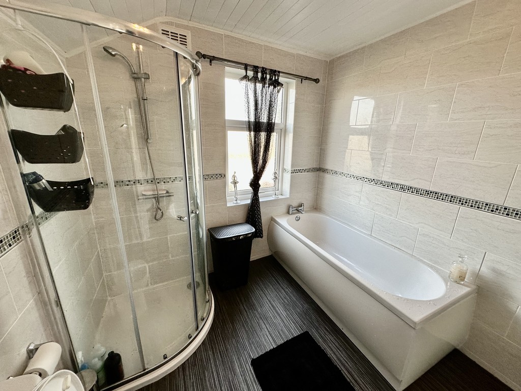 BATHROOM 7' 11" x 11' 1" (2.43m x 3.40m) Fantastic large bathroom with separate shower corner shower cubicle, bath, low flush WC, wash hand basin, tiled walls, radiator, storage cupboard and a rear facing double glazed frosted window.