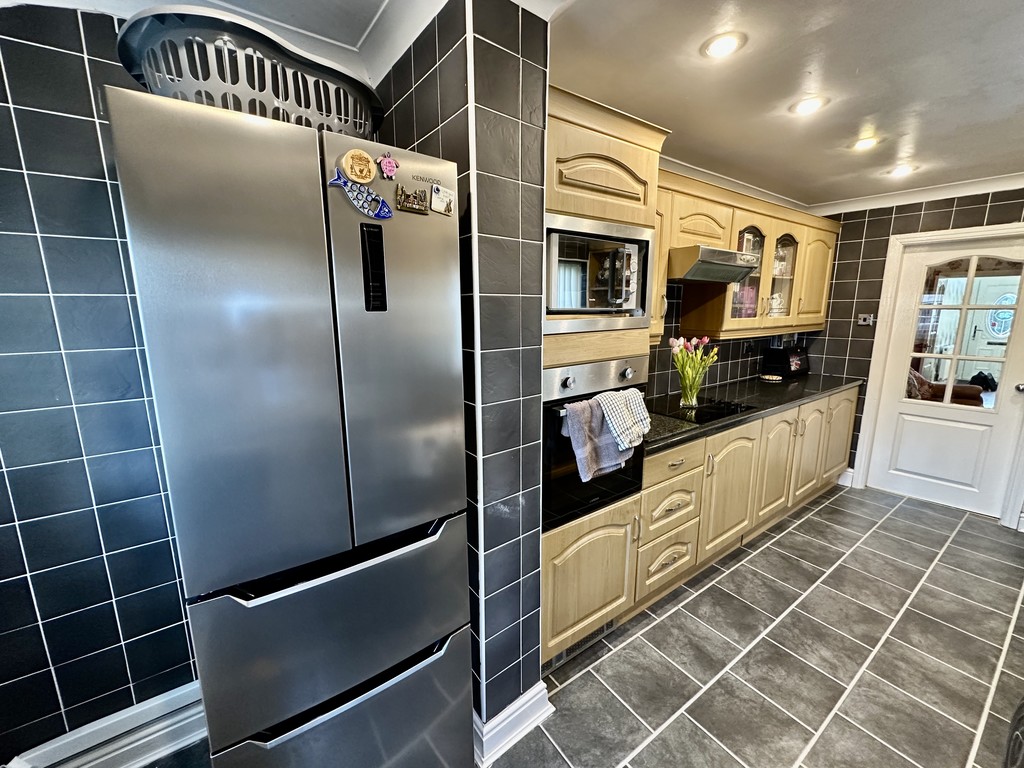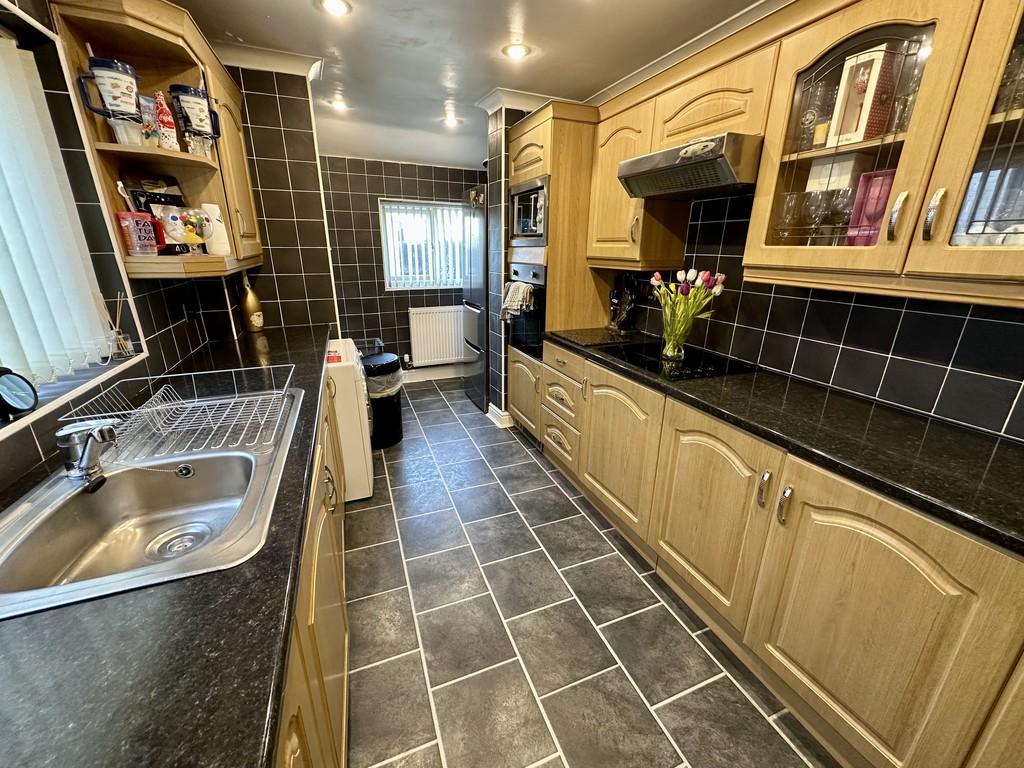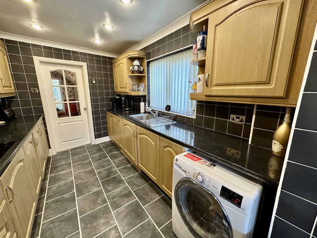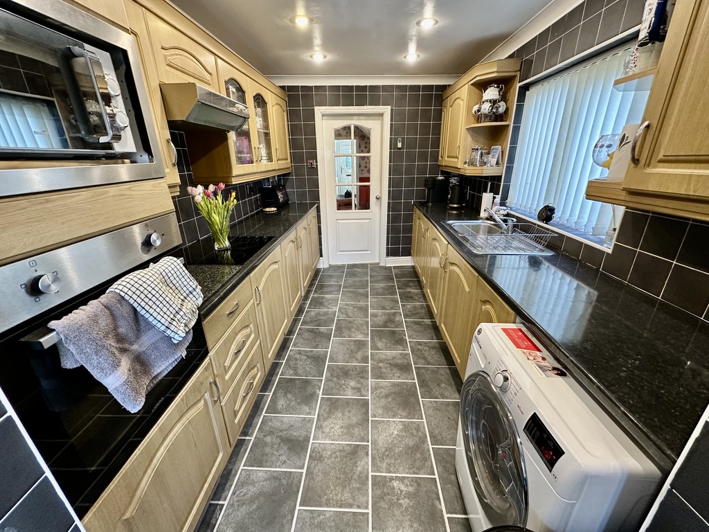KITCHEN 7' 11" x 15' 11" (2.42m x 4.86m) Nicely presented kitchen with a range of modern fitted units at both eye and base level, work surfaces incorporating a single bowl sink with drainer, four ring electric hob with extractor fan above, electric single oven, space for a microwave, plumbing for a washing machine, space for a fridge/freezer, tiled walls, radiator, spotlights, coving, side facing door to the garden, side facing double glazed window and rear facing double glazed window.