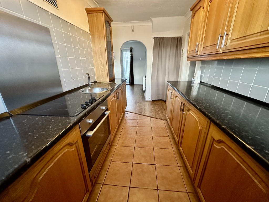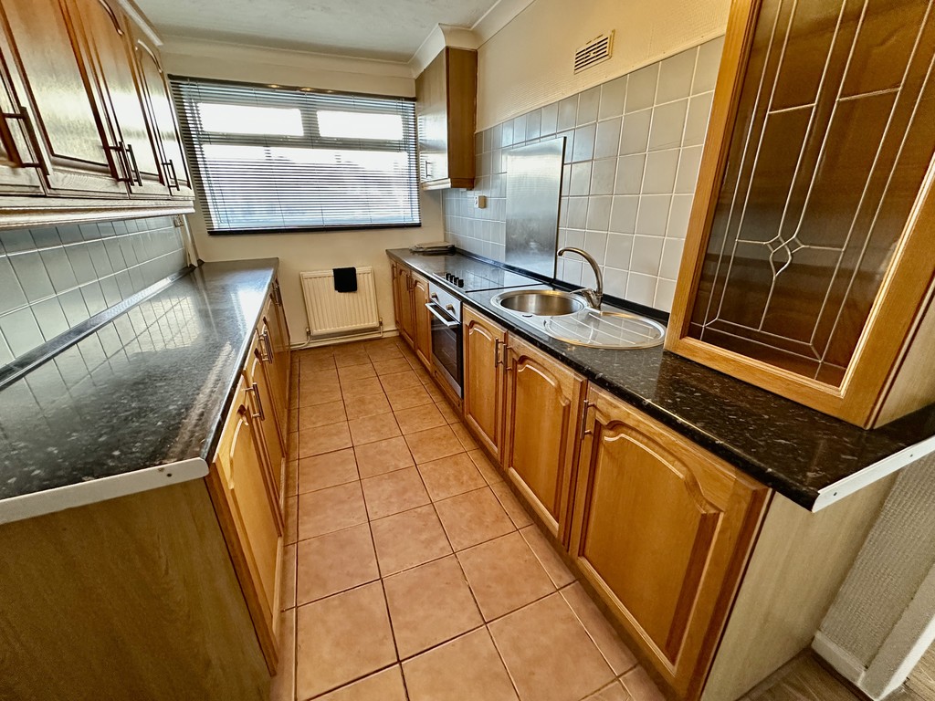KITCHEN 14' 5" x 7' 0" (4.40m x 2.14m) Nicely presented kitchen with a range of fitted cabinetry at both eye and base level, work surfaces incorporating a single bowl sink with drainer, four ring electric hob, electric single oven, integrated fridge/freezer, partially tiled walls, radiator, coving, storage cupboard beneath the stairs, rear facing double glazed window and access to the utility space.