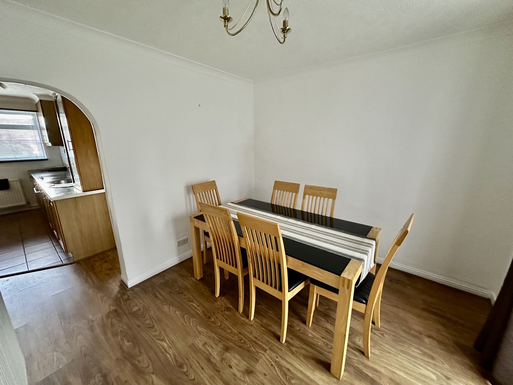 DINING ROOM 9' 10" x 9' 9" (3.02m x 2.99m) Lovely reception room with open arch to the kitchen, front facing double glazed window, radiator, coving, ceiling rose and laminate flooring.