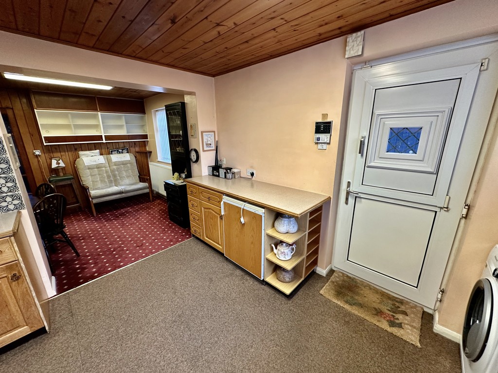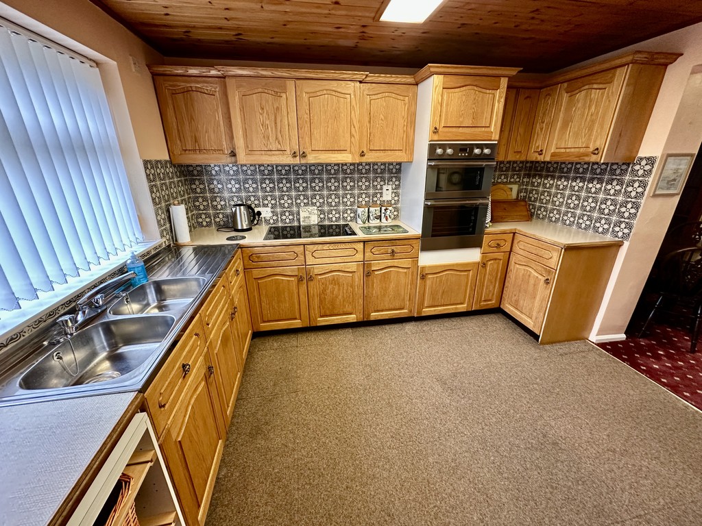 EXTENDED KITCHEN 10' 7" x 11' 2" (3.23m x 3.41m) Nicely presented kitchen which offers plenty of space, with fitted cabinetry at both eye and base level, work surfaces incorporating a dual sink with drainer, four ring electric hob, extractor fan, double electric oven, fridge, plumbing for a washing machine, partially tiled walls, wood panelled ceiling, rear facing double glazed window and side facing double glazed stable door to the driveway.