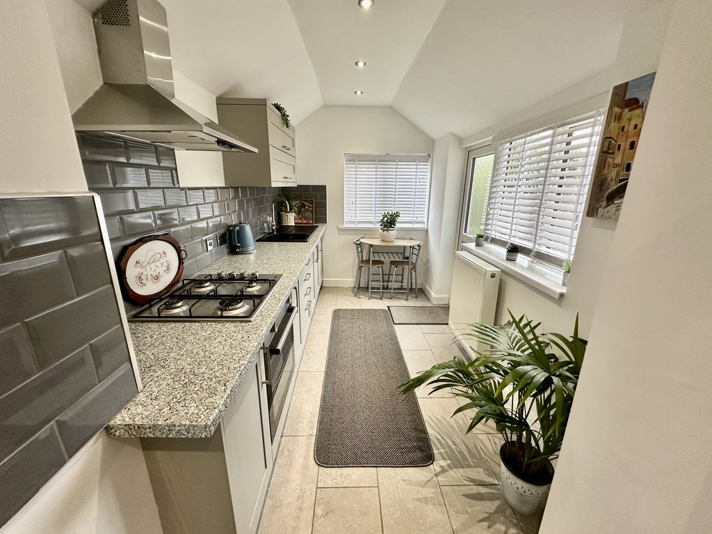 KITCHEN 6' 7" x 21' 2" (2.03m x 6.47m) Fantastic long kitchen with a range of fitted modern cabinetry, stunning work surfaces incorporating a single bowl sink with drainer, four ring gas hob with extractor fan above, single electric oven, space for a fridge/freezer, plumbing for a washing machine, tiled flooring, space for a breakfast table, two radiators, two side facign double glazed windows, rear facing double glazed window, side facing double glazed frosted door and partially tiled walls.