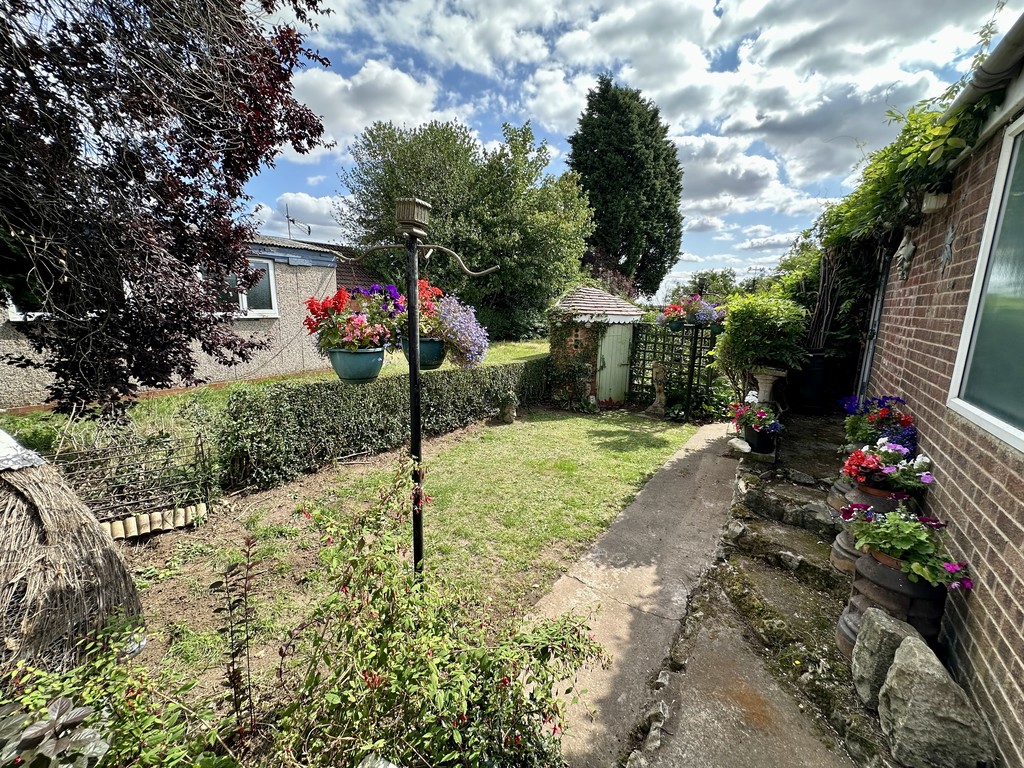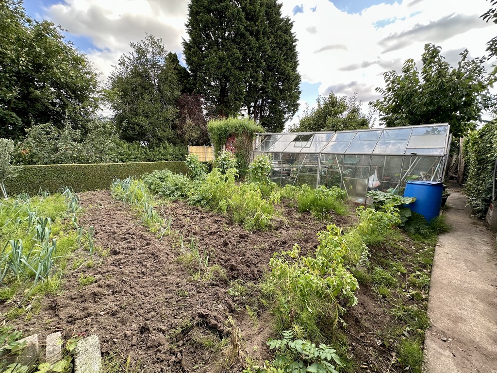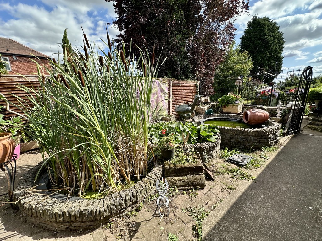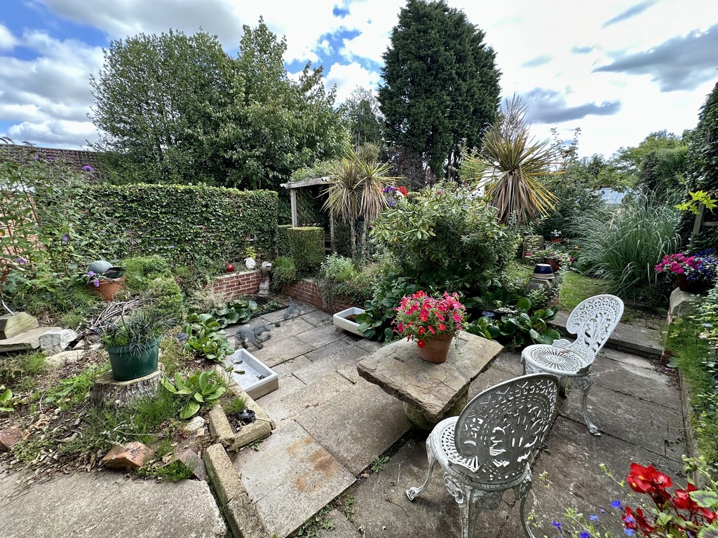 REAR GARDEN A tiered rear garden with multiple current uses, upper raised paved patio with central water features, steps down to two lower separate gardens with central lawn and mixed flower/shrub beds, rear vegetable garden with sheds for storage and an outside WC.
