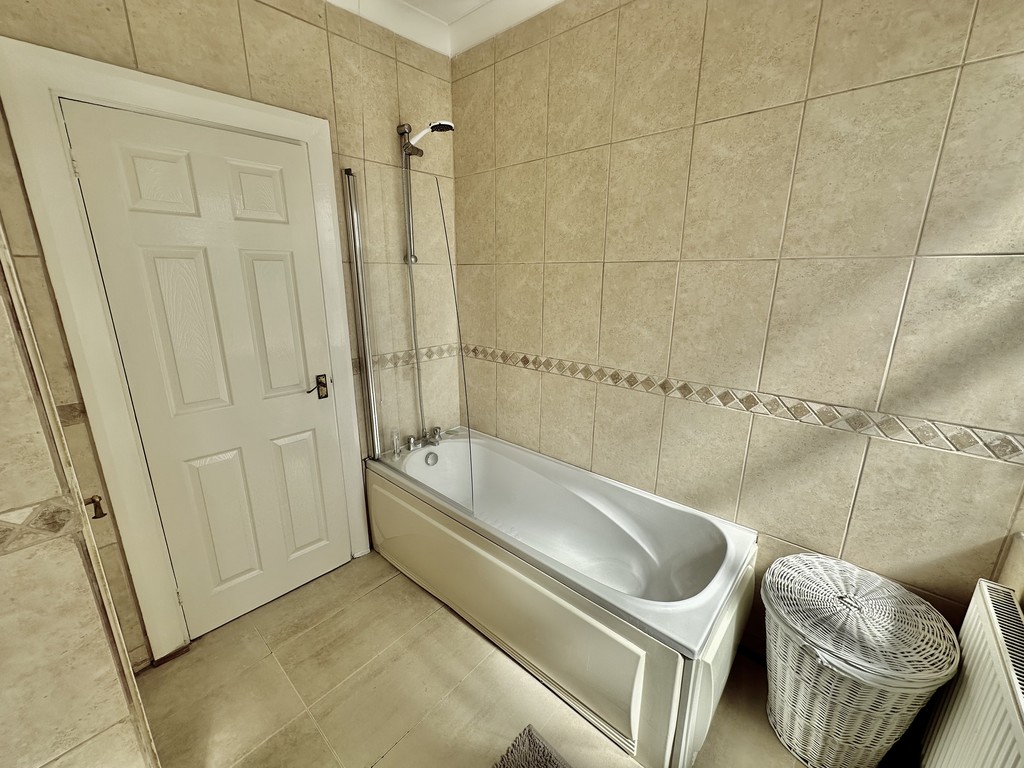 BATHROOM Spacious bathroom with low flush WC, wash hand basin within a vanity unit, bath with shower attachment, shower screen mounted above, heated towel radiator, tiled walls, coving, storage cupboard and two rear facing double glazed frosted windows.
