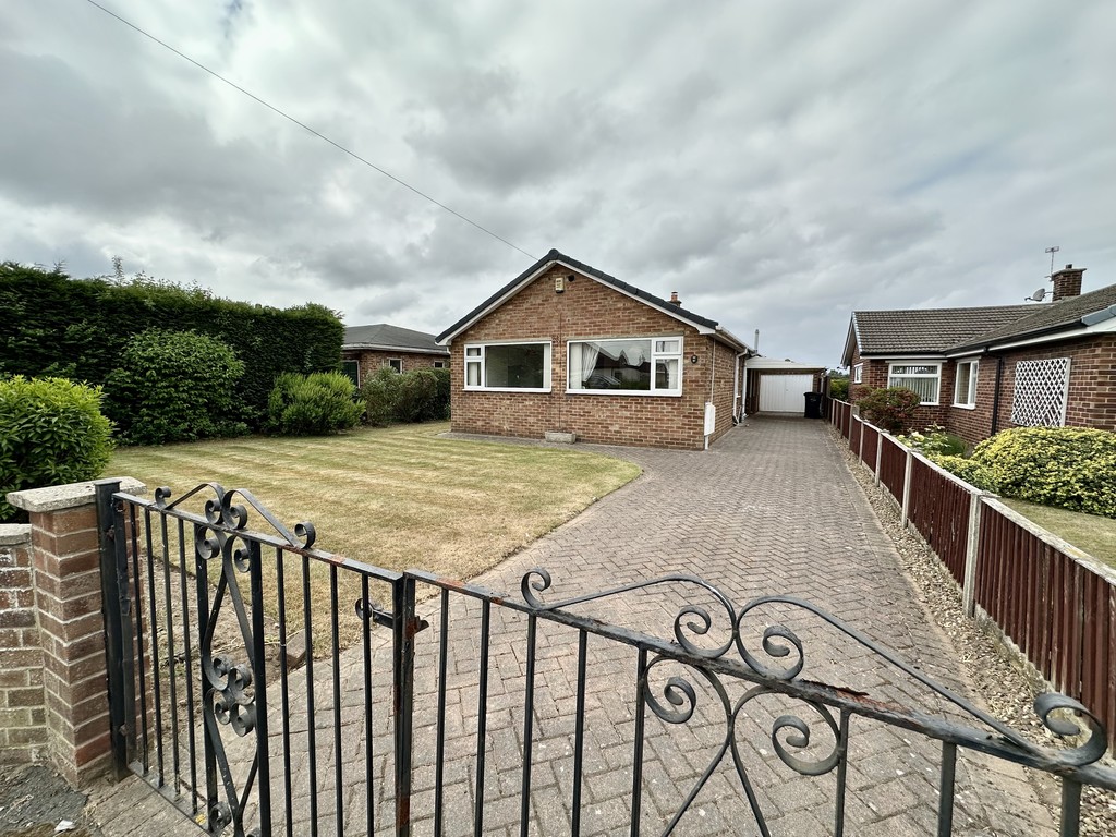 FRONT GARDEN & DRIVEWAY Lawned front garden with surrounding bushes/shrubs, paved driveway is accessed via double gates, hedge to the side, wall to the front and further driveway to the side of the bungalow, also providing access to the side gate leading to the rear garden.