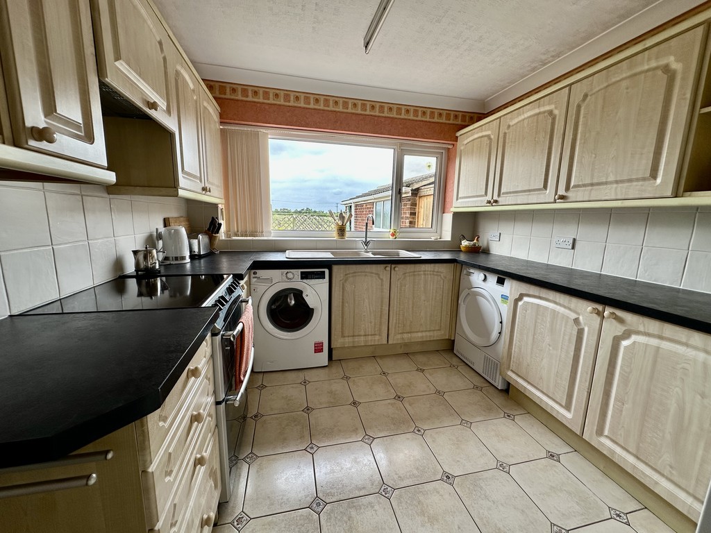 KITCHEN 9' 5" x 10' 9" (2.89m x 3.29m) Nicely presented kitchen with a range of fitted cabinetry at both eye and base level, work surfaces incorporating a dual sink with drainer, space for a fridge/freezer, plumbing for a washing machine, electric cooker/hob included, tiled flooring, partial tiled walls, side facing double glazed window, rear facing double glazed window and space for a tumble dryer.