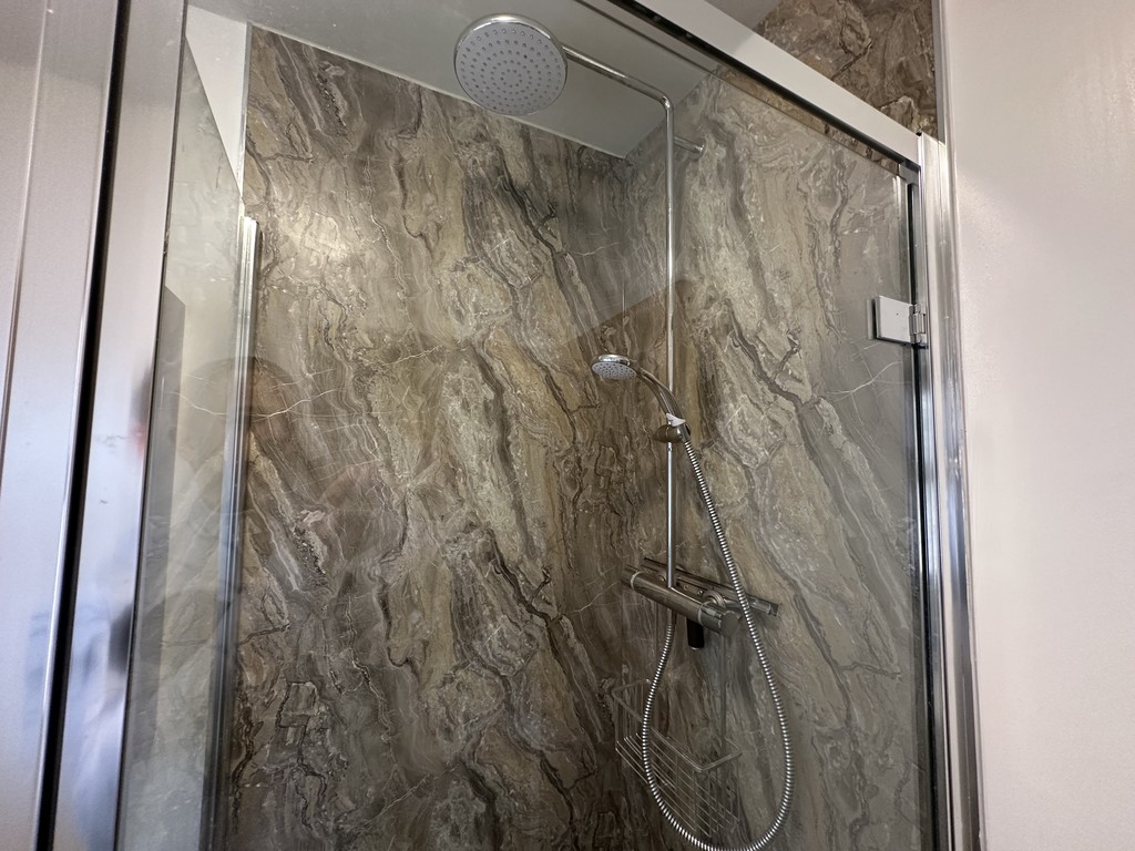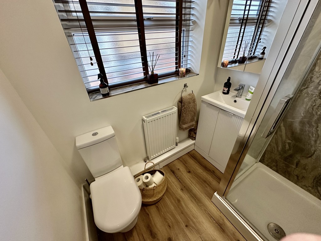 SHOWER ROOM 6' 1" x 5' 5" (1.86m x 1.66m) Immaculately presented shower room comprising of a wash hand basin within a vanity unit, low flush WC, shower cubicle with dual shower head, stylish splash back, extractor fan, laminate flooring, wall mounted mirrored cabinet and a side facing double glazed frosted window.