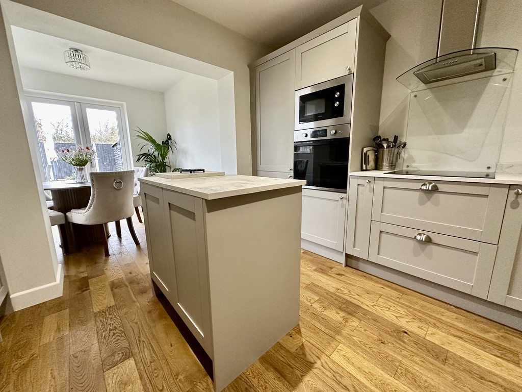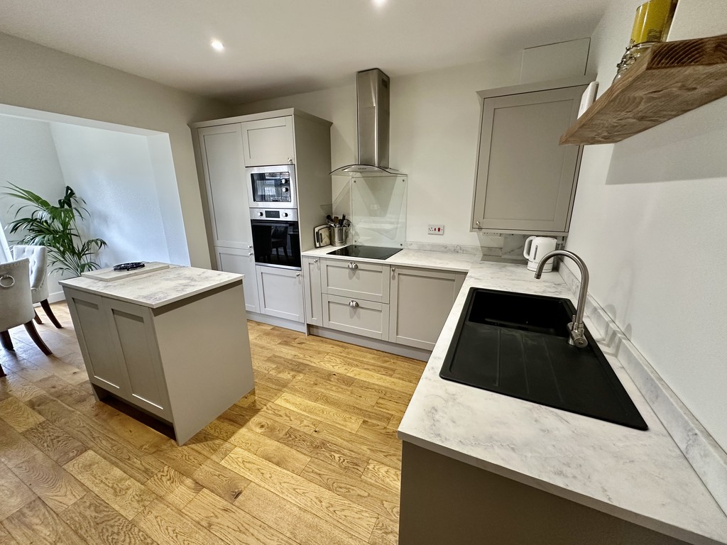 KITCHEN 11' 3" x 11' 2" (3.45m x 3.41m) Stunning modern kitchen with a range of matching cabinetry at both eye and base level, square edge work surfaces incorporating a single bowl sink with drainer, matching splash backs, central storage island with the same work surface, integrated fridge/freezer, integrated dishwasher, wine cooler included, integrated washing machine, boiler housed in matching cupboard, four ring induction hob with extractor hood above, oak flooring, spotlights, radiator and open access to the extension at the rear.