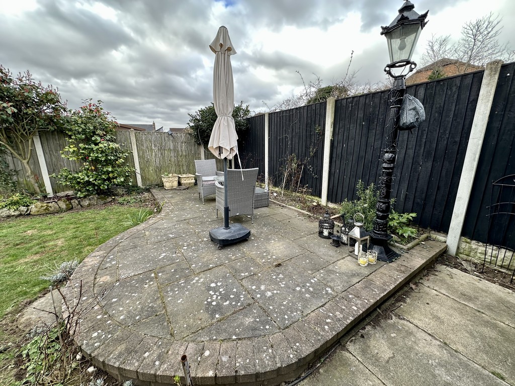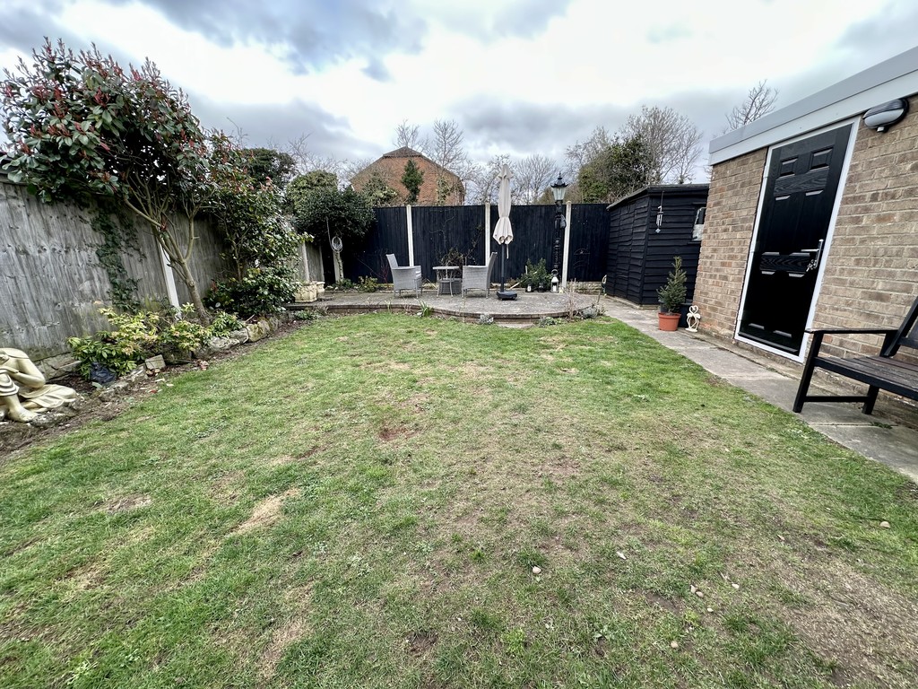 REAR GARDEN & SHED Pleasant private rear garden with fence enclosure, raised paved patio, rockery to the side with, trees, bushes, flower beds and shed for storage included.