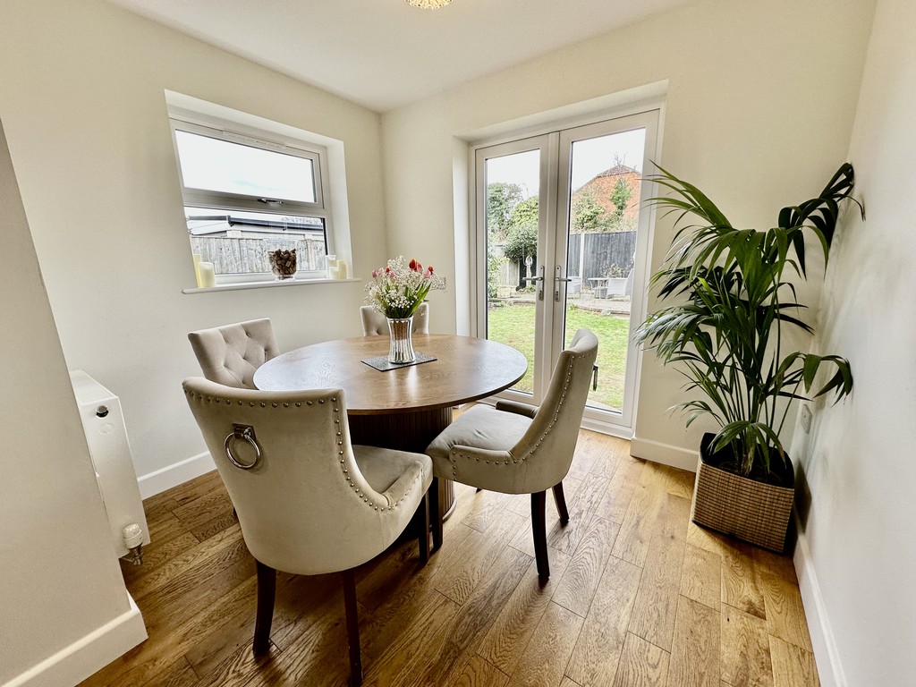 EXTENDED DINING AREA 9' 0" x 7' 0" (2.76m x 2.15m) lovely addition to the property with views over the rear garden via the rear facing double glazed French doors to the garden, side facing double glazed window, oak flooring, radiator and open access to the kitchen.