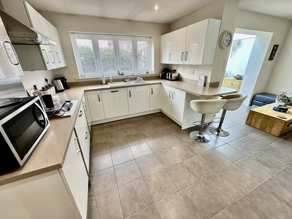 KITCHEN/DINER 20' 0" x 8' 7" (6.12m x 2.62m increasing to 3.97m) Superb kitchen/dining space that now offers open access to the extension at the rear, providing the perfect family entertaining room with fitted modern cabinetry at both eye and base level, work surfaces with matching splash backs incorporating a single and half bowl sink with drainer, matching breakfast bar, four ring gas hob with extractor fan, double electric oven, space for an American style fridge/freezer, integrated dishwasher, spotlights and door to the utility room.