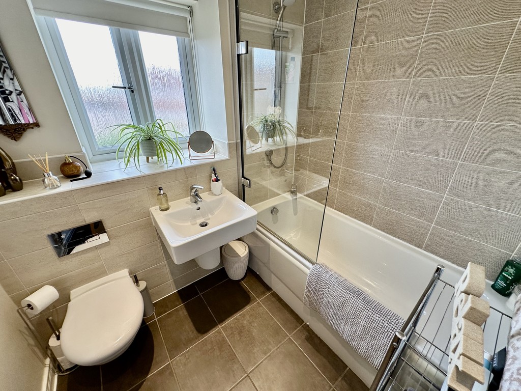 BATHROOM 6' 9" x 6' 5" (2.07m x 1.98m) Lovely bathroom with a three piece suite comprising of a low flush WC, wash hand basin, bath with a shower screen mounted above, partially tiled walls, tiled flooring, heated towel radiator and rear facing double glazed frosted window.
