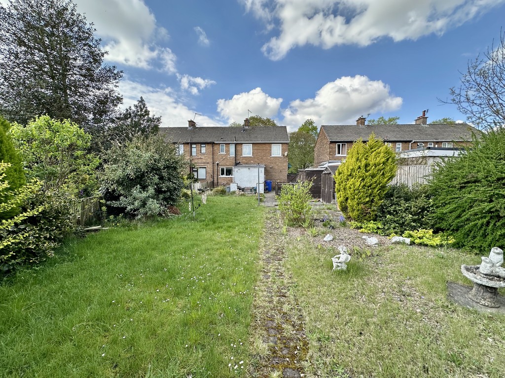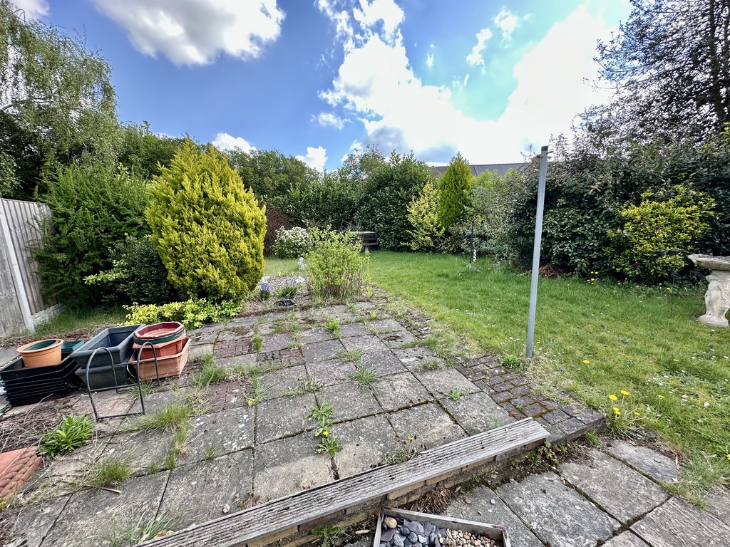 REAR GARDEN Fabulous large rear garden with paved patio, raised decking, two sheds, upper patio and raised lawn, mature hedge/bushes and side access gate to the front.