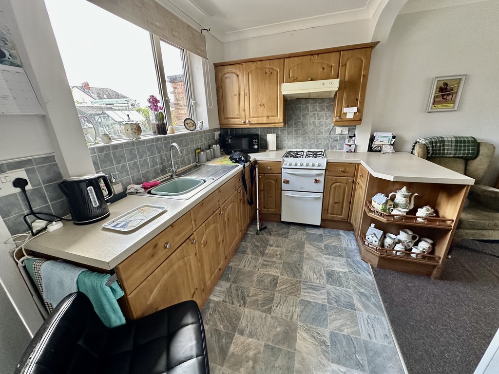 KITCHEN 11' 8" x 5' 11" (3.56m x 1.82m) Nicely presented kitchen with a range of fitted cabinetry, work surfaces incorporating a single bowl sink with drainer, partially tiled walls, space for a freestanding cooker with gas hob, door to the utility room, rear facing double glazed window, storage cupboard beneath the stairs and open access to the dining area at the front.