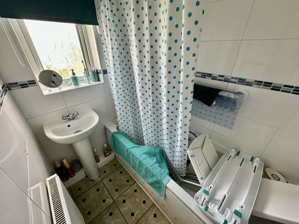BATHROOM 4' 4" x 6' 1" (1.33m x 1.87m) Rear facing double glazed frosted window, radiator, wash hand basin, bath with electric shower unit, shower curtain rail, tiled walls, extractor fan, radiator and rear facing double glazed frosted window.