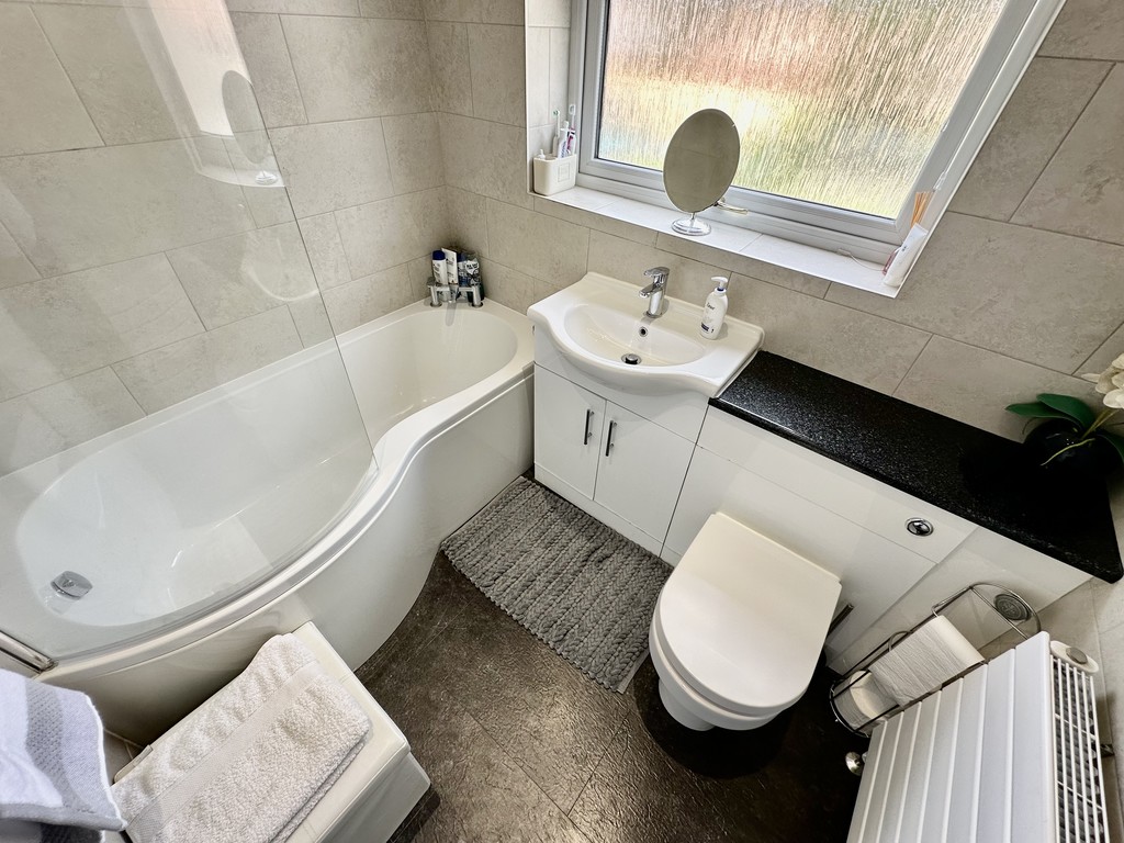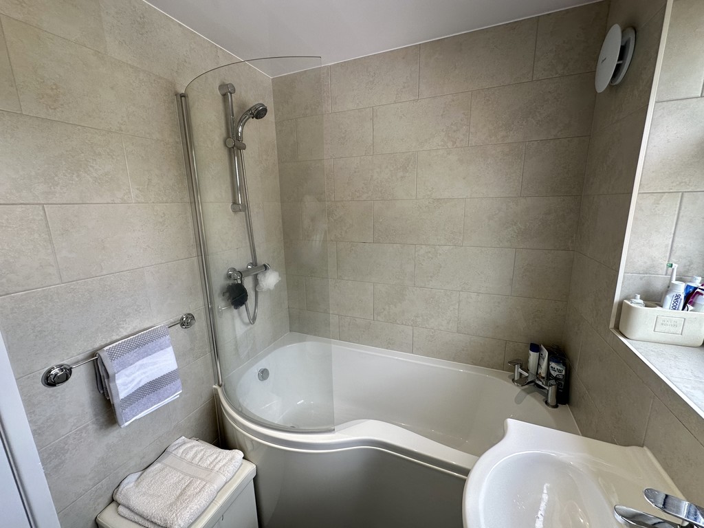 BATHROOM 7' 0" x 5' 5" (2.15m x 1.66m) Fantastic bathroom with a three piece suite comprising of a low flush WC, wash hand basin within a vanity unit, P-shaped bath with glass shower screen, shower unit above, spotlights, extractor fan, tiled walls, radiator and a rear facing double glazed frosted window.