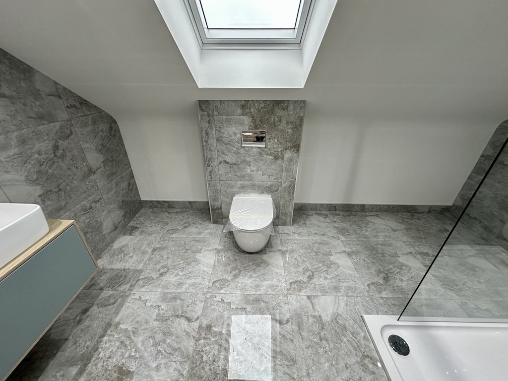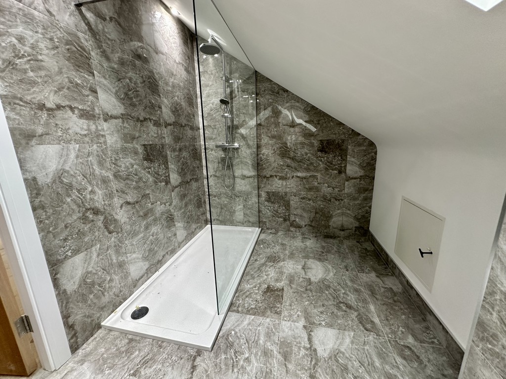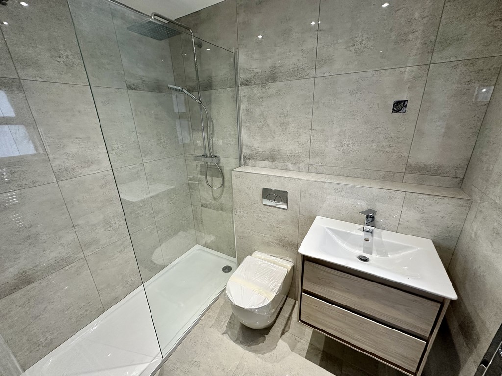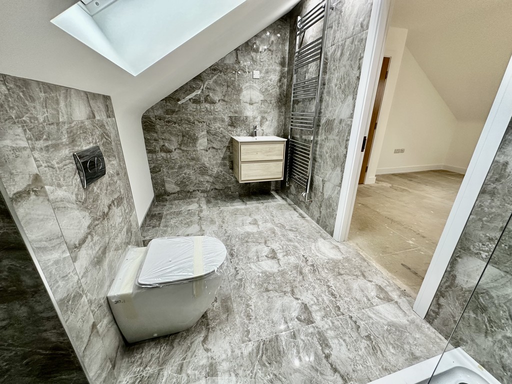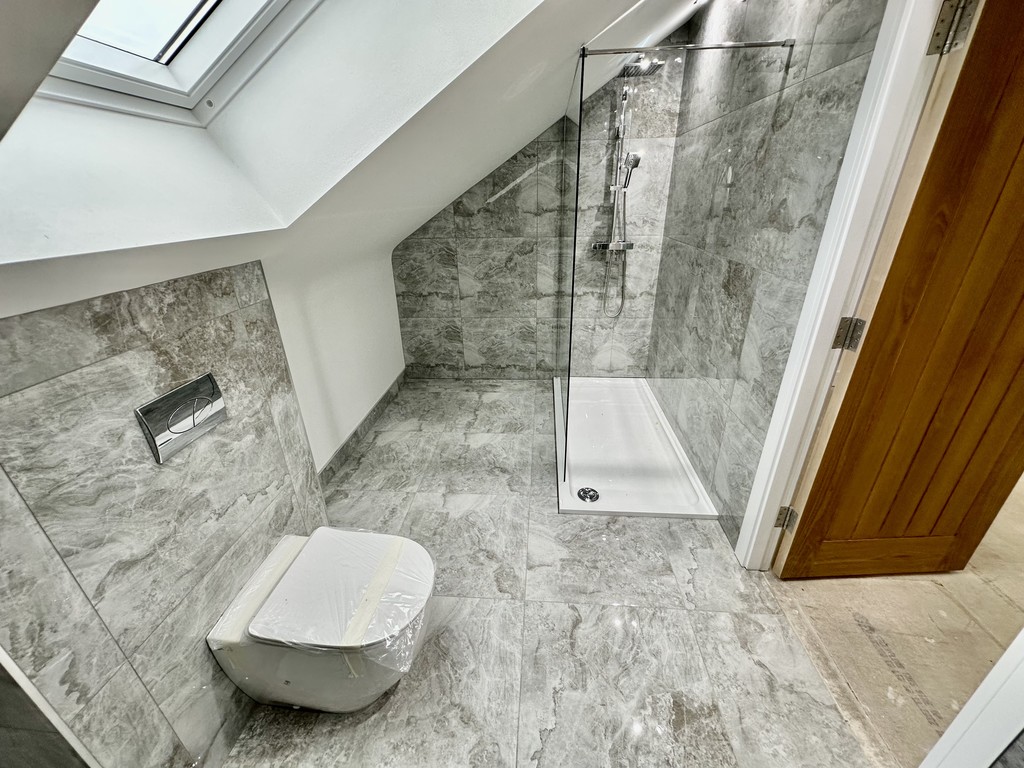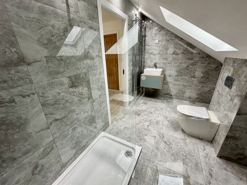 Further beautiful en-suite shower room with walk-in shower, glass divide, dual shower head, low flush WC, wash hand basin within a vanity unit, heated towel radiator, porcelain partially tiled walls/flooring, spotlights, extractor fan and front facing double glazed window.
