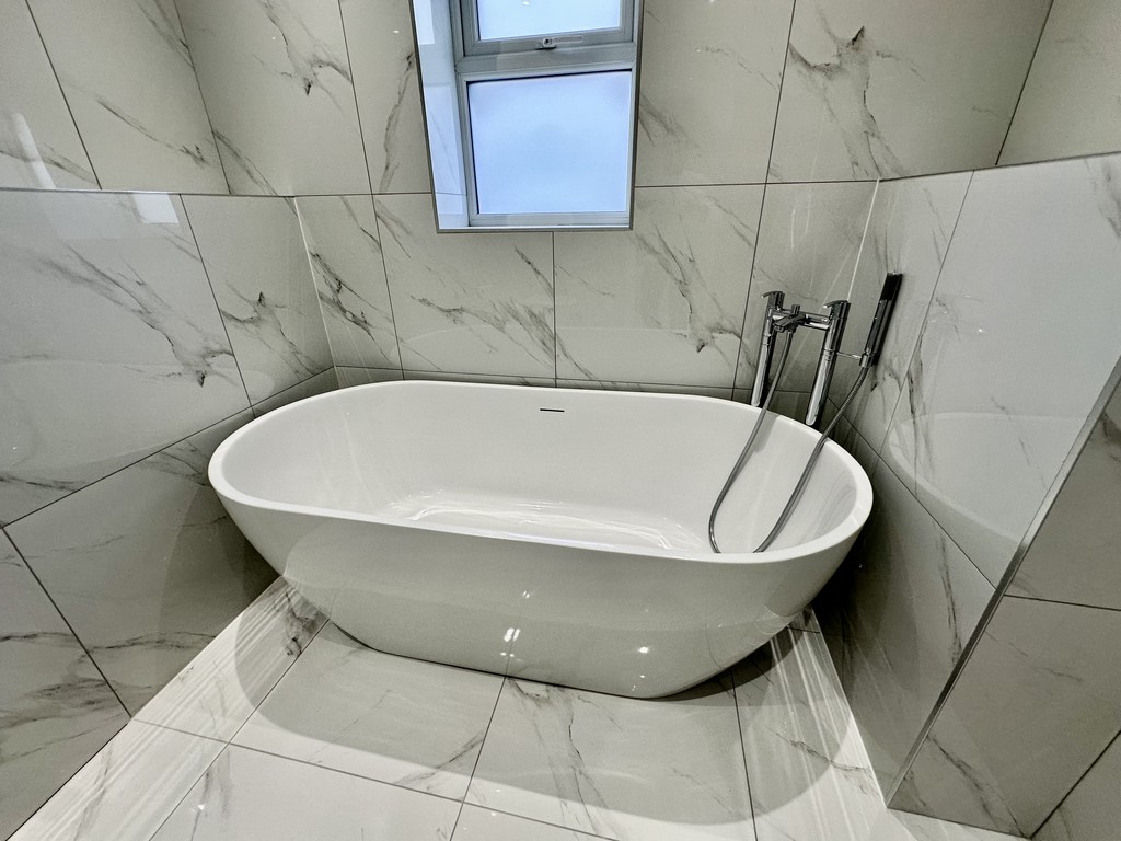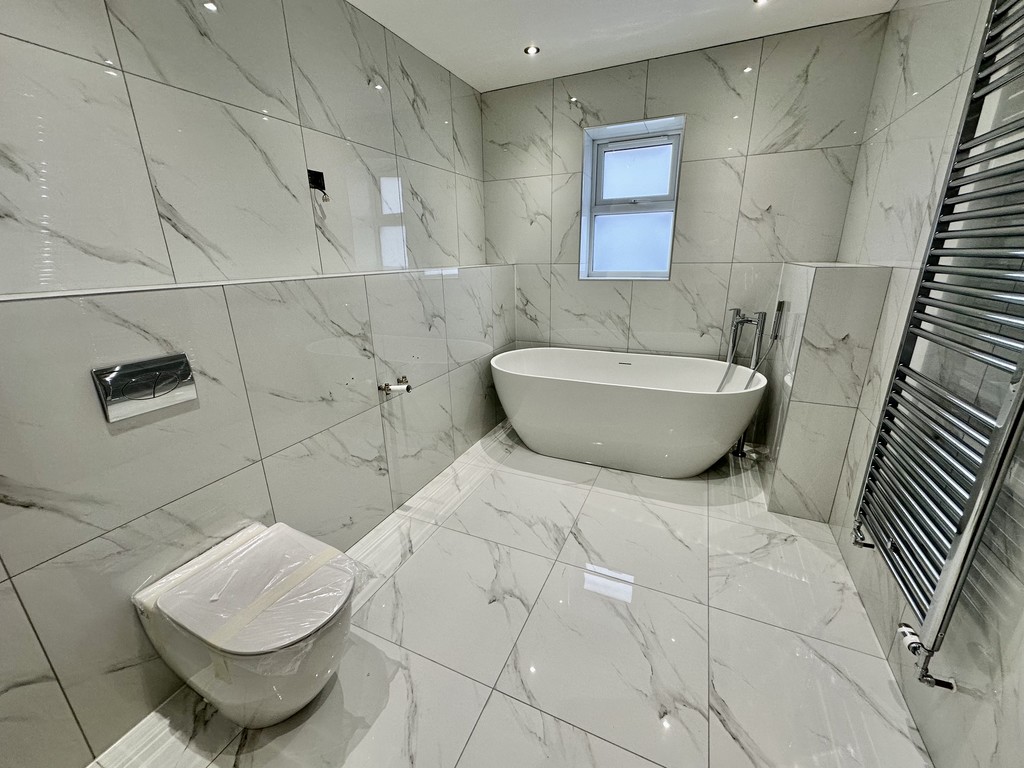 Superb bathroom with low flush WC, wash hand basin, freestanding bath with corner chrome tap, porcelain tiled flooring and walls, spotlights to the ceiling, extractor fan, heated towel radiator and side facing double glazed frosted window.