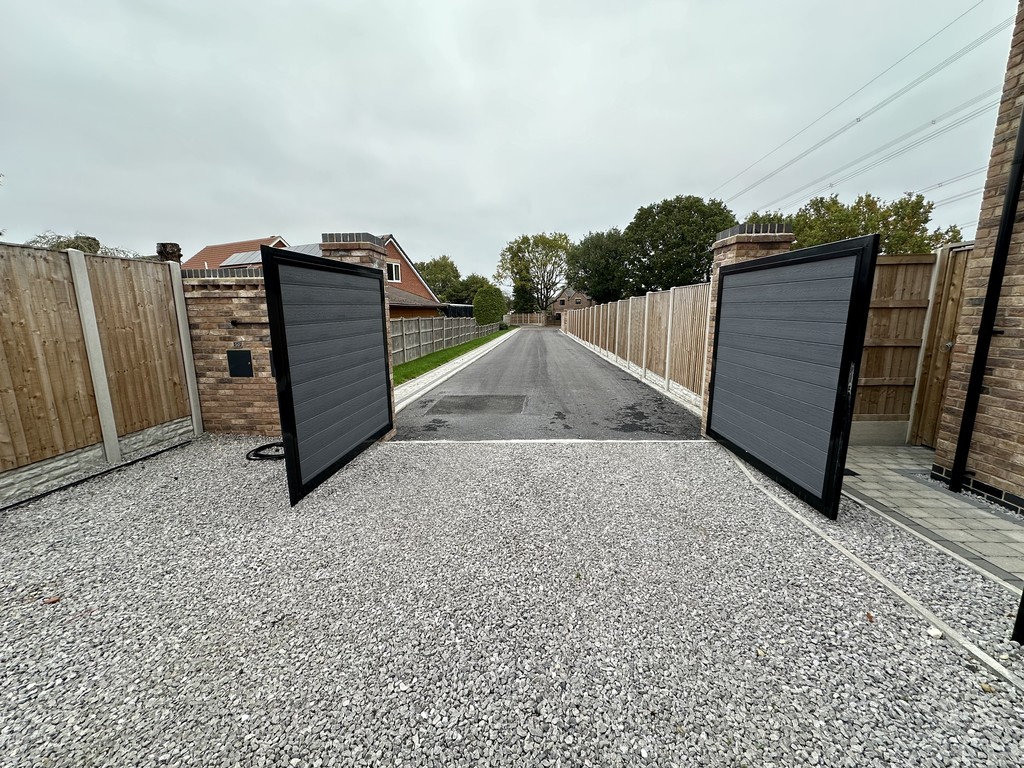 Shared driveway access to the electric gated entry with fob, to the paved/gravelled off street parking on the driveway and in front of the double garage.