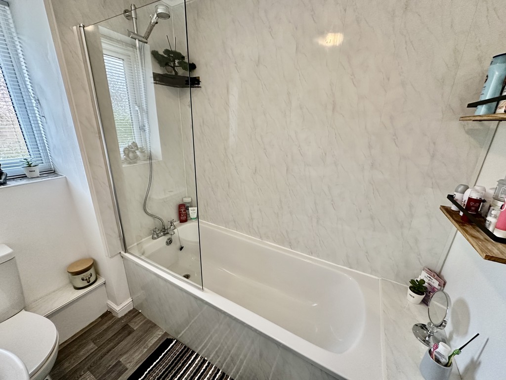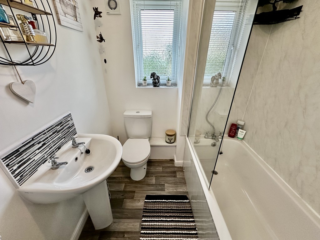 BATHROOM 7' 4" x 5' 8" (2.25m x 1.75m) Nicely presented bathroom comprising of a three piece suite with low flush WC, wash hand basin, bath with glass shower screen mounted above, shower attachment, extractor fan, radiator and rear facing double glazed frosted window.