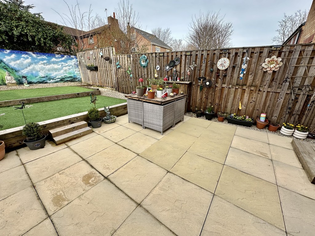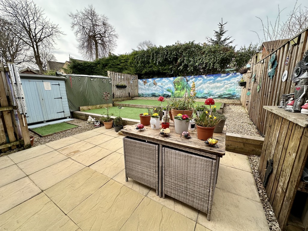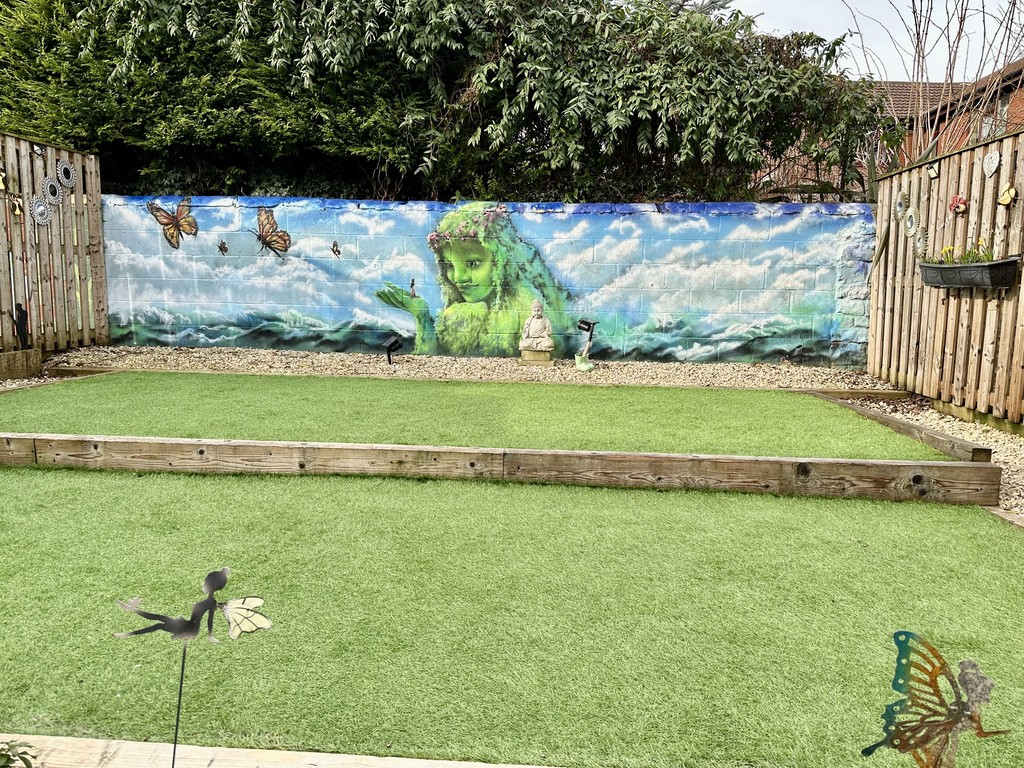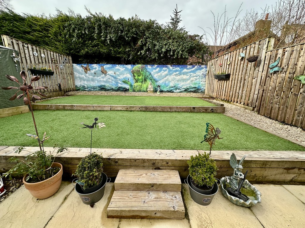 REAR GARDEN This garden is delightful once again with tiered astro turf, gravelled areas, paved patio, fence/wall enclosure and beautiful wall artwork to the rear.
