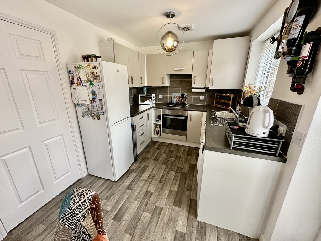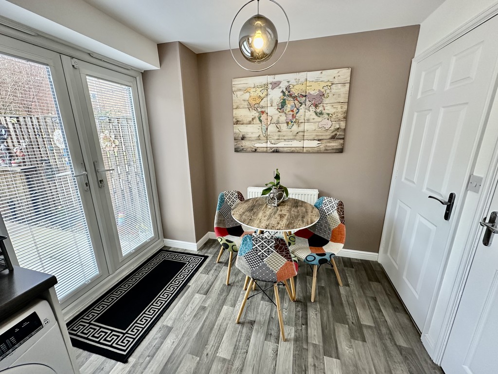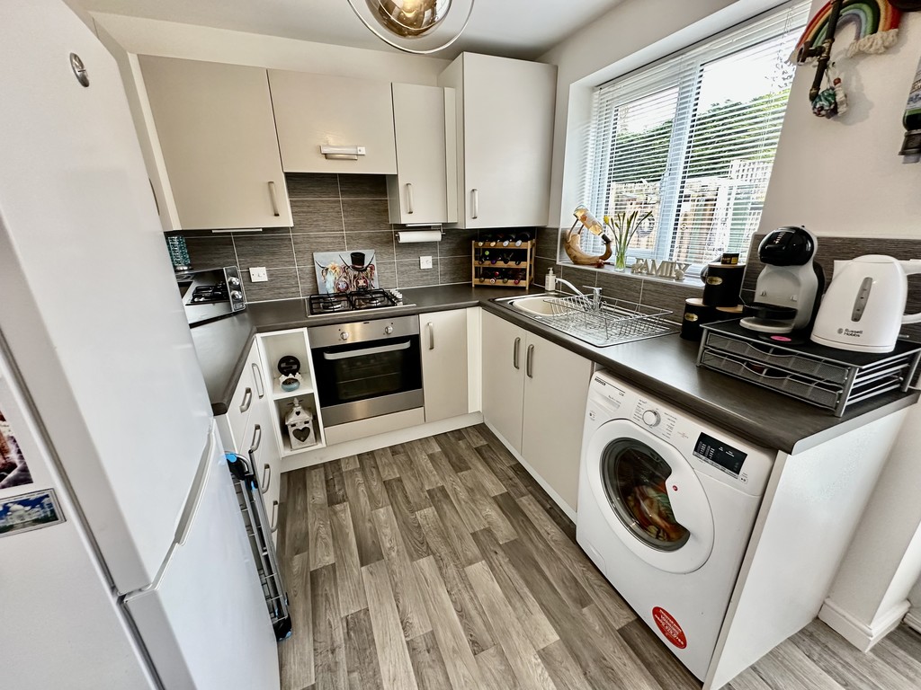 KITCHEN/DINER 7' 10" x 13' 5" (2.39m x 4.09m) Stunning kitchen/diner with views over the garden via the rear facing double glazed window, rear facing double glazed French doors to the patio, modern fitted kitchen cabinetry at both eye and base level, work surfaces incorporating a single bowl sink with drainer, partially tiled splash backs, four ring gas hob with extractor fan, single electric oven, space for a fridge/freezer, plumbing for a washing machine, boiler housed in matching cupboard, radiator and door to the WC.
