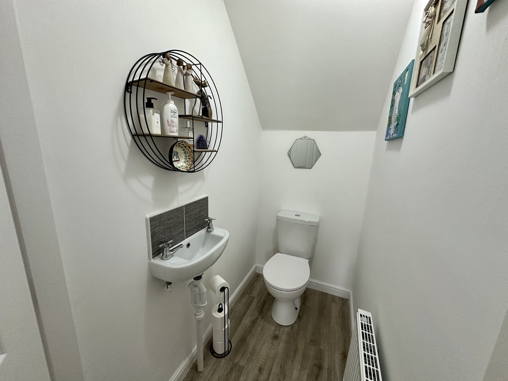 WC 5' 4" x 3' 2" (1.64m x 0.97m) Benefitting from a low flush WC, wash hand basin, radiator, extractor fan and partially tiled wall.