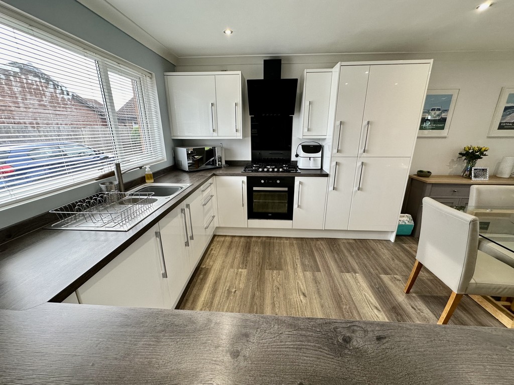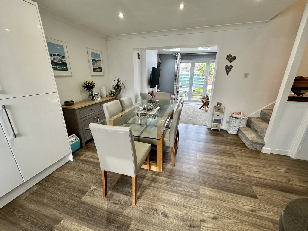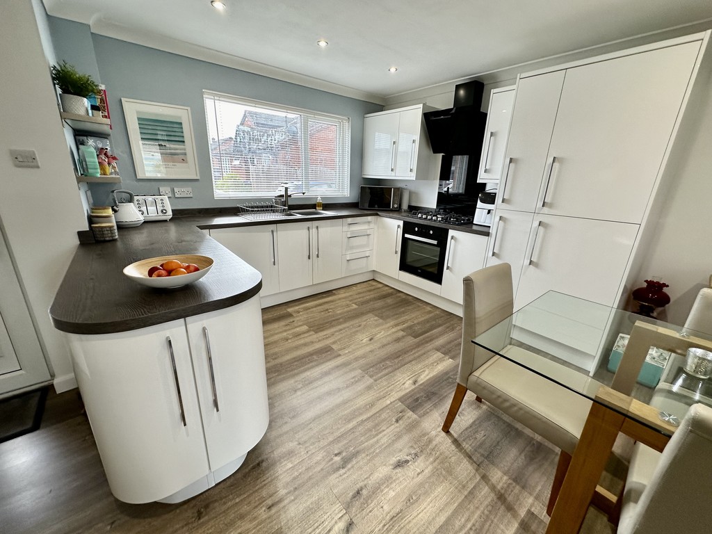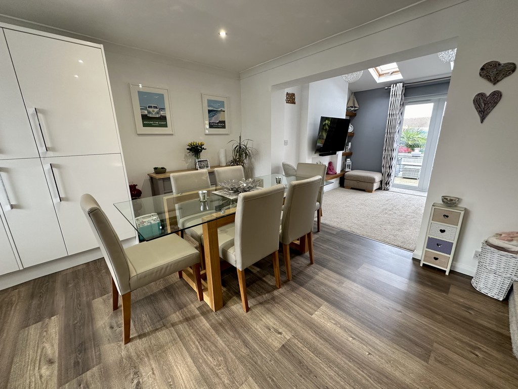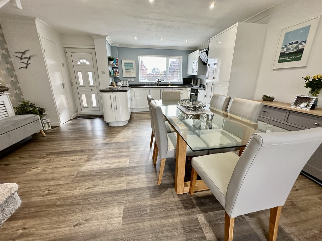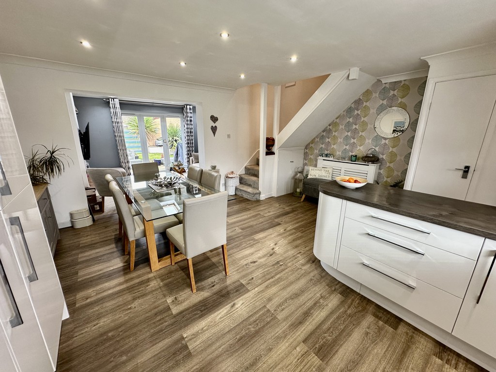KITCHEN/DINER 16' 7" x 16' 6" (5.06m max x 5.05m max) Stunning modern kitchen space with plenty of dining area perfect for entertaining, the open access to the extension adds to the feeling of generous space. The fantastic kitchen offers a range of fitted cabinetry, square edge work surfaces incorporating a single and half bowl sink with drainer, five ring gas hob with extractor fan above, single electric oven, integrated fridge/freezer, integrated washing machine, integrated bin, spotlights to the ceiling, coving, laminate flooring throughout, front facing double glazed window, radiator and storage cupboard beneath the stairs.